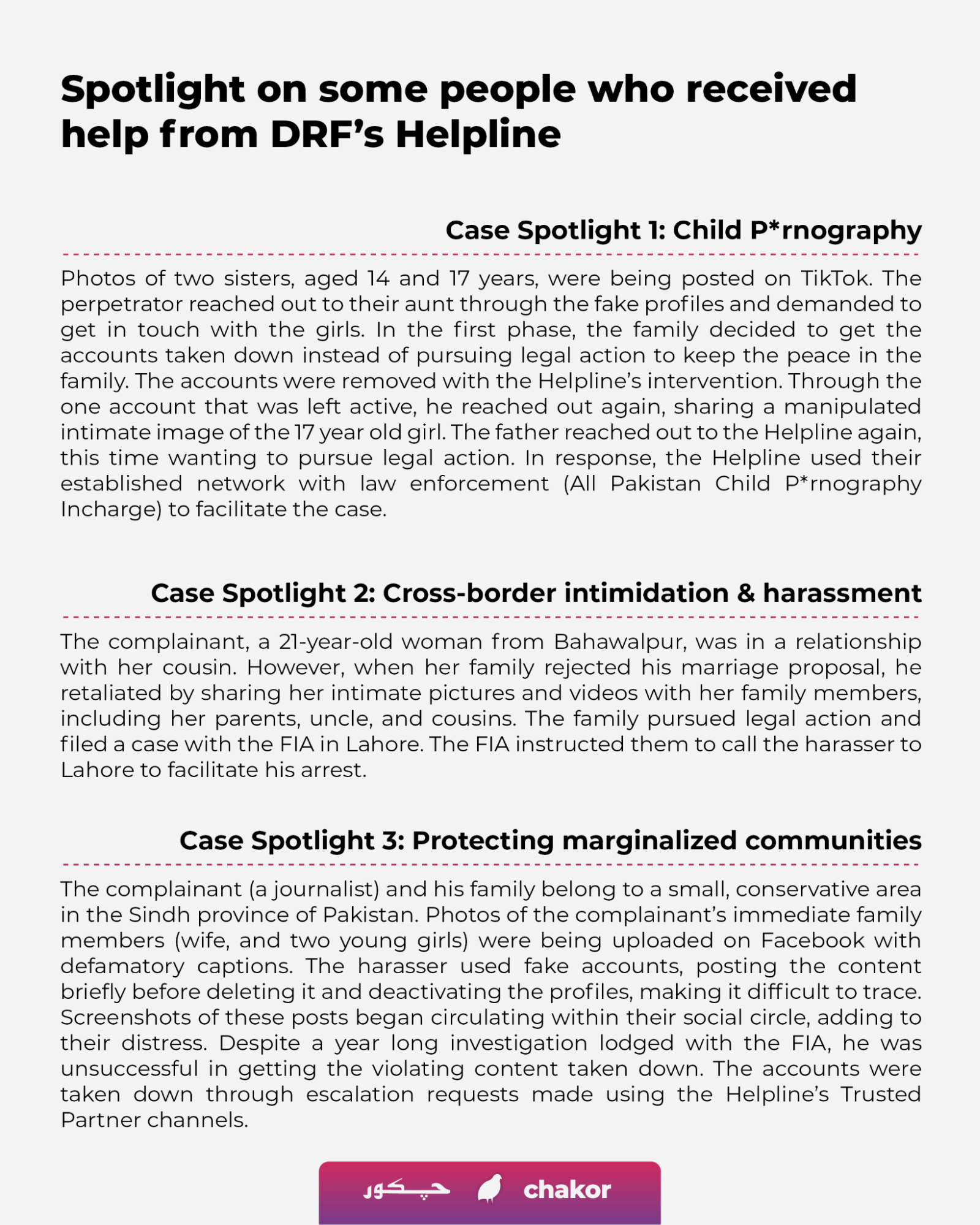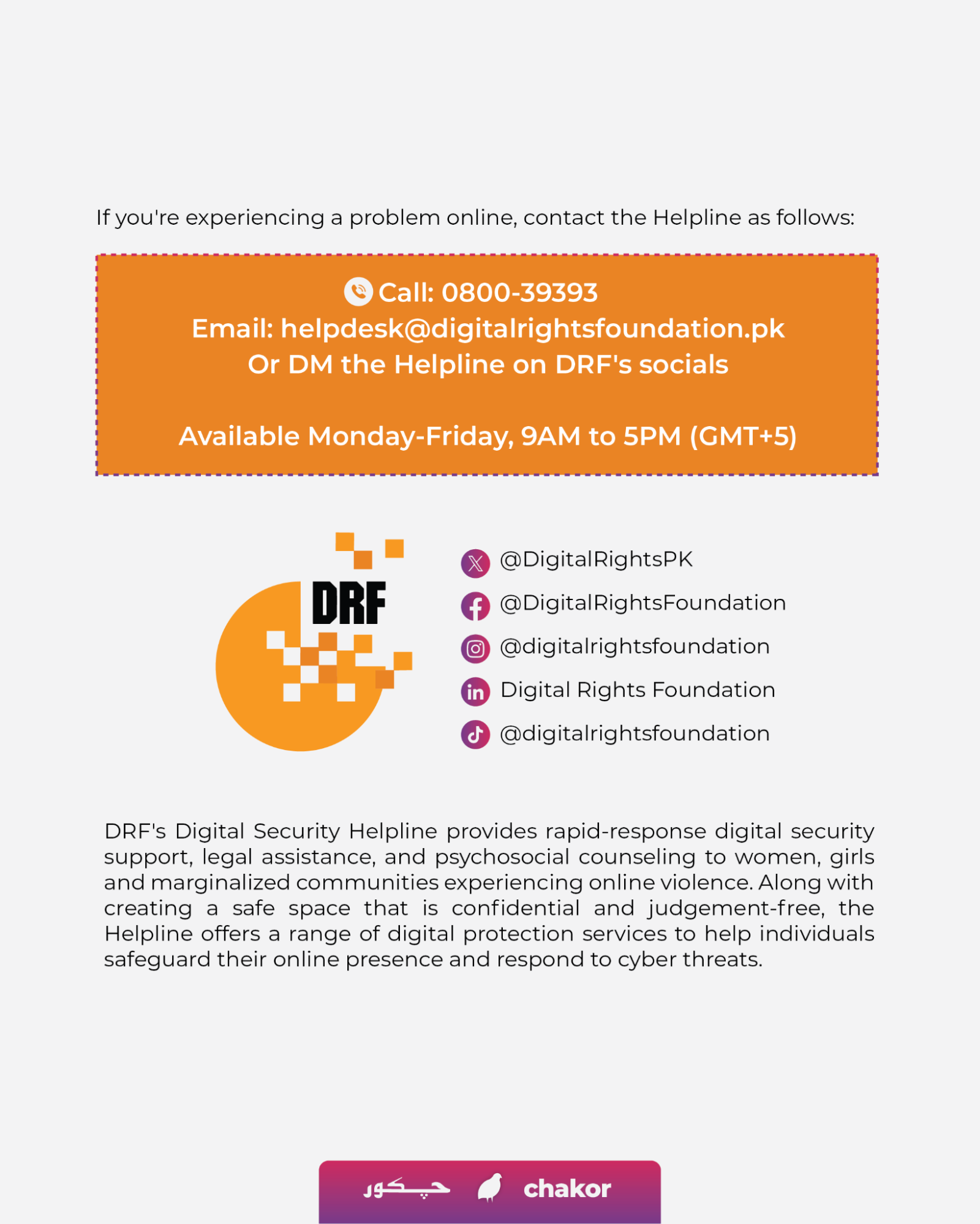 If you’re encountering a problem online, you can reach out to our helpline at 0800-39393, email us at helpdesk@digitalrightsfoundation.pk or reach out to us on our social media accounts. We’re available for assistance from 9 AM to 5 PM, Monday to Sunday.