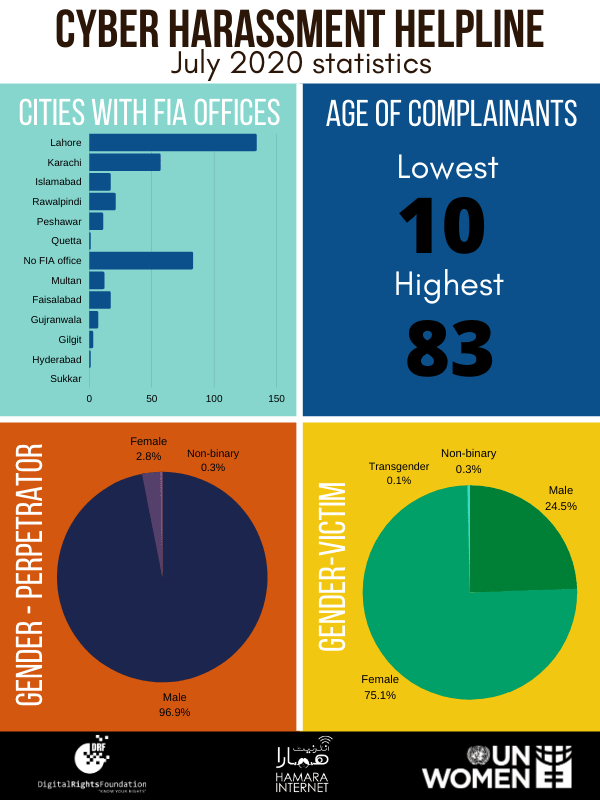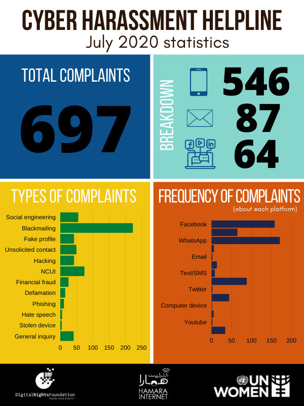In July we’ve seen an almost 70% increase in cases reported to our Helpline. As we’ve seen in the past, Facebook and WhatsApp were platforms from where the most cases originated. We need to all work together to make the internet a safer space.@unwomen_pak @aisha_mukhtar pic.twitter.com/vBAxpDWGBM