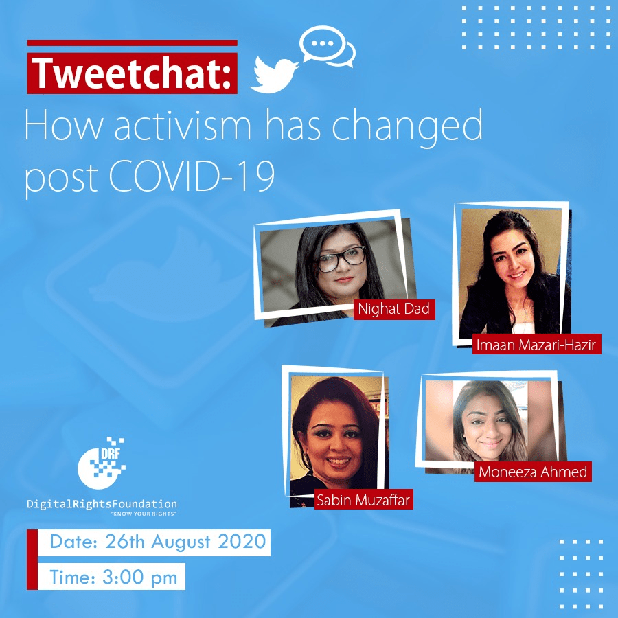 DRF organized a tweetchat on 26th August 2020, around how activism has changed post COVID19. The participants in the tweetchat were Nighat Dad (lawyer, human rights activist and Facebook oversight board member), Imaan Mazari (lawyer and human rights activist), Moneeza Ahmed (feminist, humanistic therapist and an activist focusing on community development) and Sabin Muzaffar (founder and executive director of Ananke- a digital platform empowering women through awareness, advocacy and education). The tweetchat was an extension of DRF’s online campaign on #ActivismInPandemic and highlighted the key issues activists have been facing during COVID19 and what social media companies can do in order to protect them.
