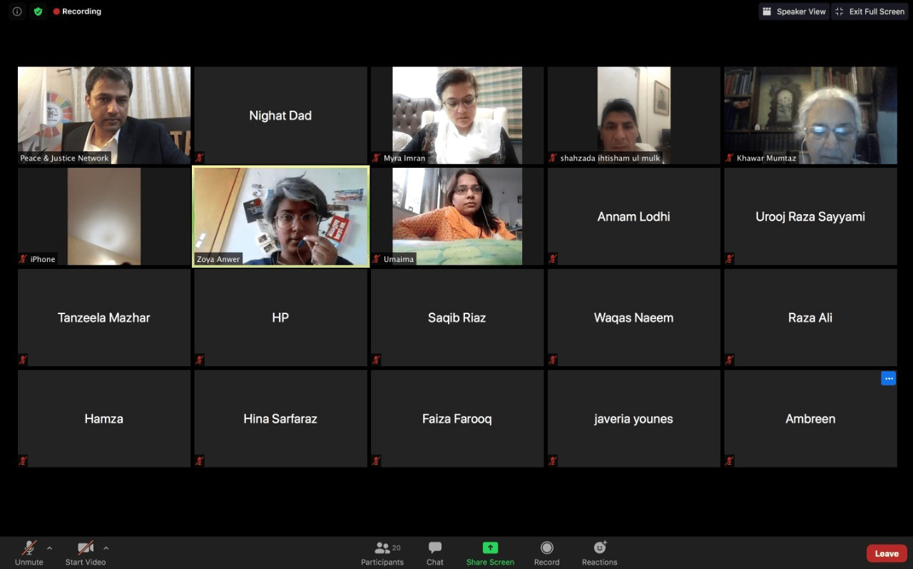DRF participated in an ‘Provincial Consultation on Gender Based Violence – Strengthening the Response’ under the Awaz II program organized by Peace & Justice Network (PJN) held on 26 August 2020. The purpose of the consultation was to identify specific advocacy points to prevent and address gender-based violence in Punjab. In addition to assessing the legislative and institutional frameworks, the consultation also examined how prevalent social norms can be changed by both improving women’s access to legal processes regarding the registration and prosecution of crimes as well as addressing public shame. The deliberations of the consultation would be used to inform the advocacy agenda for the Aawaz Provincial Forum.