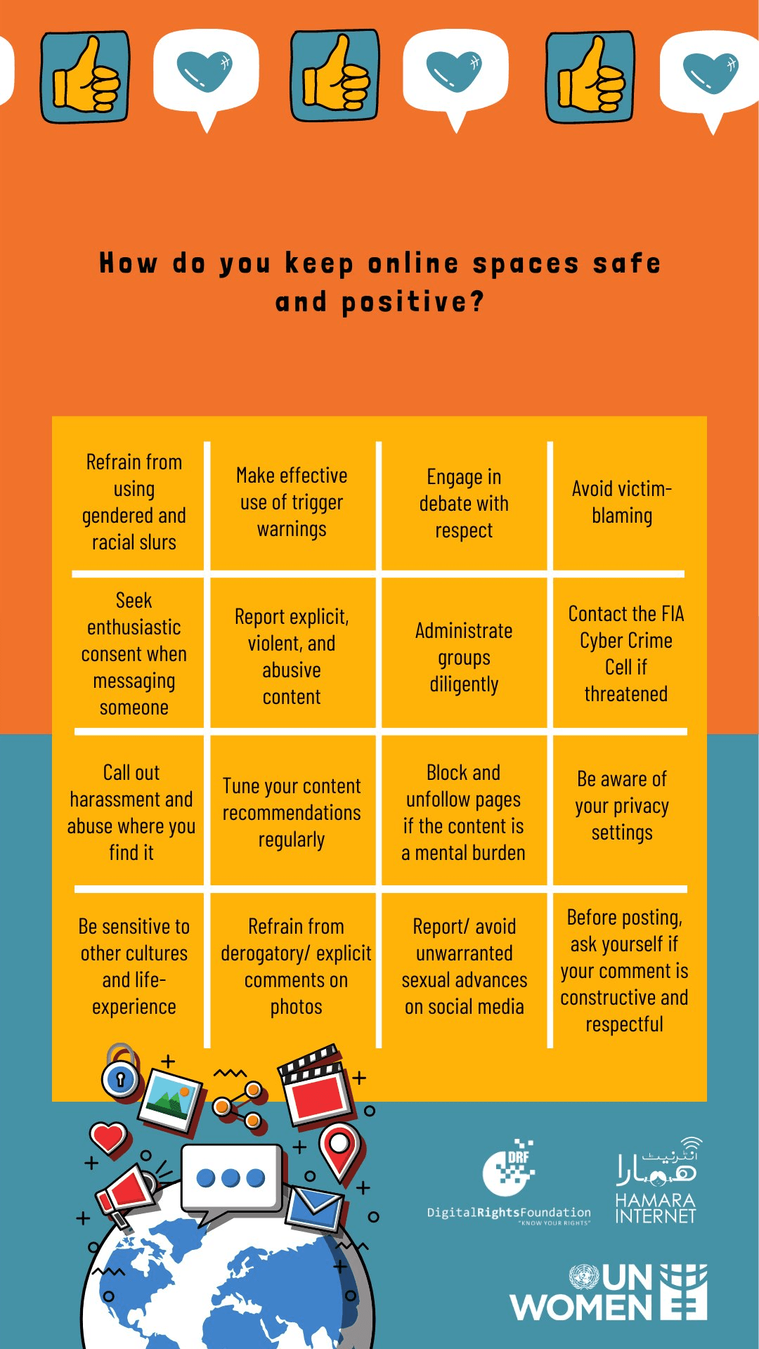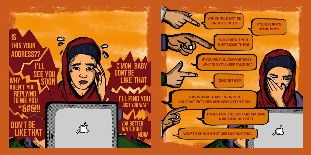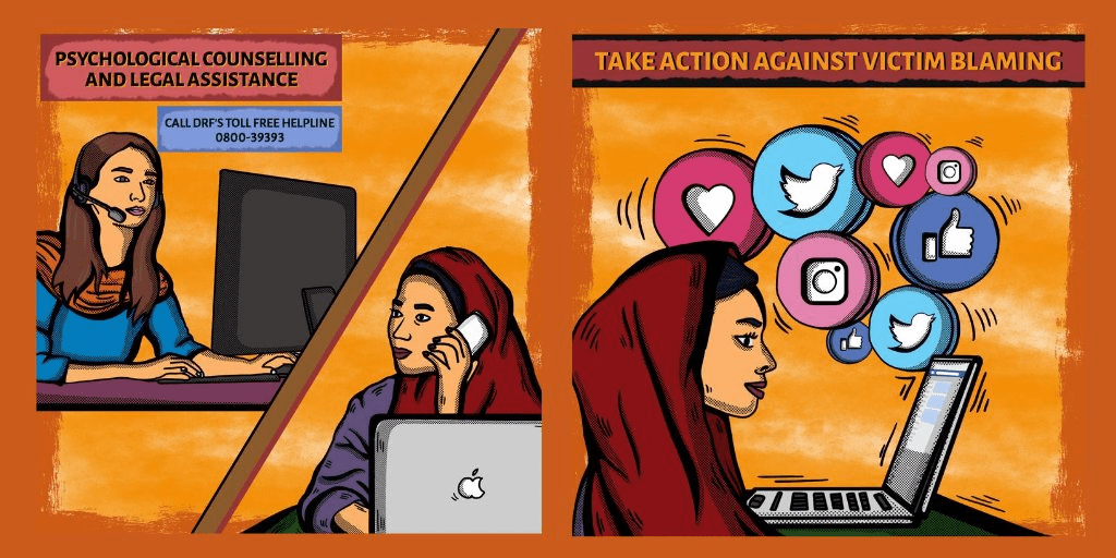 Under the Cyber Harassment Helpline advocacy campaigns, a comic strip with impactful graphics was released online which focused on victim blaming of cyber harassment. The comic strip highlighted how victim blaming decreases the likelihood that survivors will share their traumatic experience and seek support. It called on the audiences to take action against this attitude and shift the blame from the victim to the perpetrator.