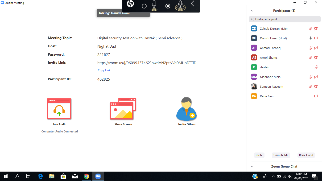 DRF conducted a semi-advanced online safety session with the team members of Dastak Charitable Organization on the 7th of August, 2020.