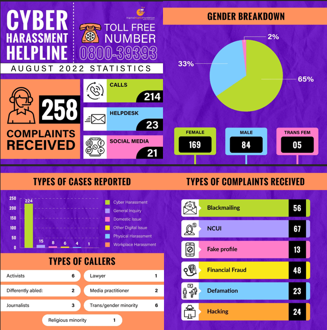 The Cyber Harassment Helpline received 258 complaints in August with 169 of these from women and 5 from trans women throughout the country. If you’re encountering a problem online you can reach out to our helpline on 0800-39393, email us at helpdesk@digitalrightsfoundation.pk or reach out to us on our social media accounts. We’re available for assistance from 9 am till 5 pm, Monday to Sunday.