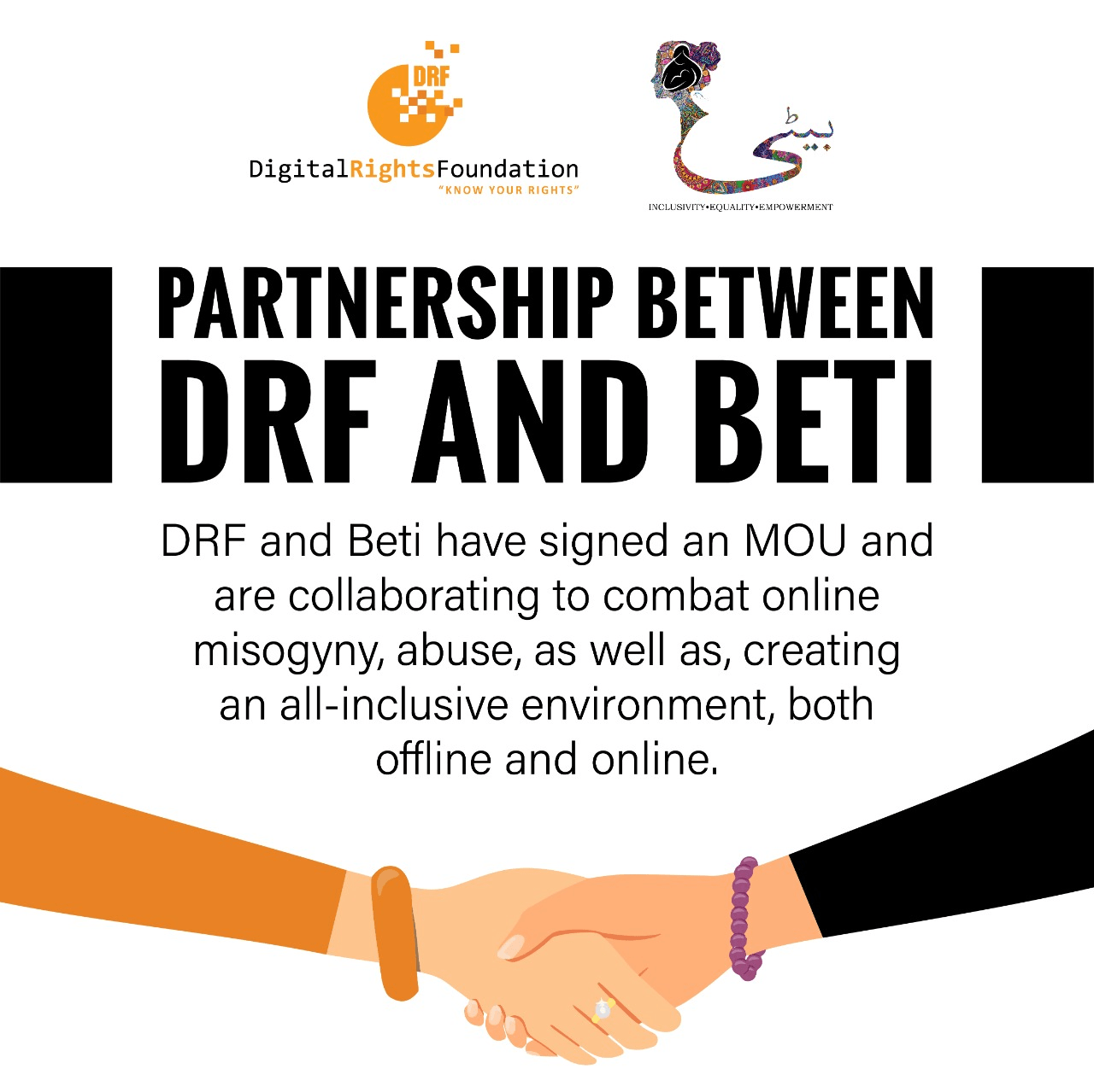 DRF and Beti No Misogyny have signed an MOU to collaborate together to fight online misogyny, hate & abuse. We hope to create an all inclusive space for everyone through this collaboration.