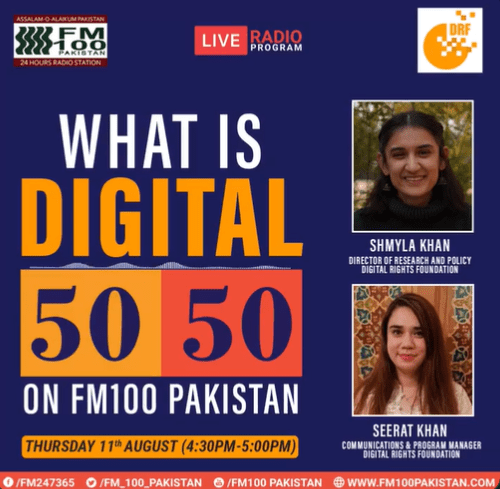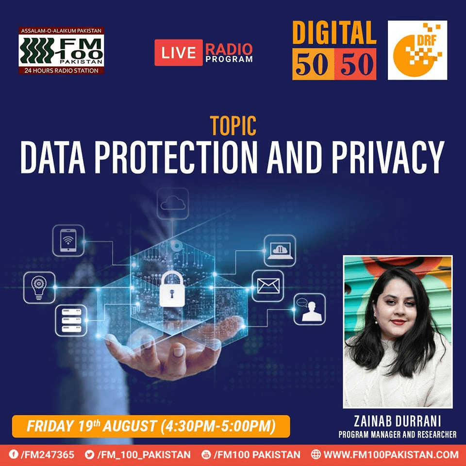 Our Program Manager Zainab Durrani spoke with RJ Haya Khan of FM 100 on the topic of ‘Data Protection and Privacy’ where the two discussed what the current landscape of data privacy looks like in Pakistan today, the overlap of gender and privacy, the gender digital divide in Pakistan and its cultural aspects, the upcoming Personal Data Protection Bill as well as DRF’s latest study on healthcare data privacy that is underway at the moment.