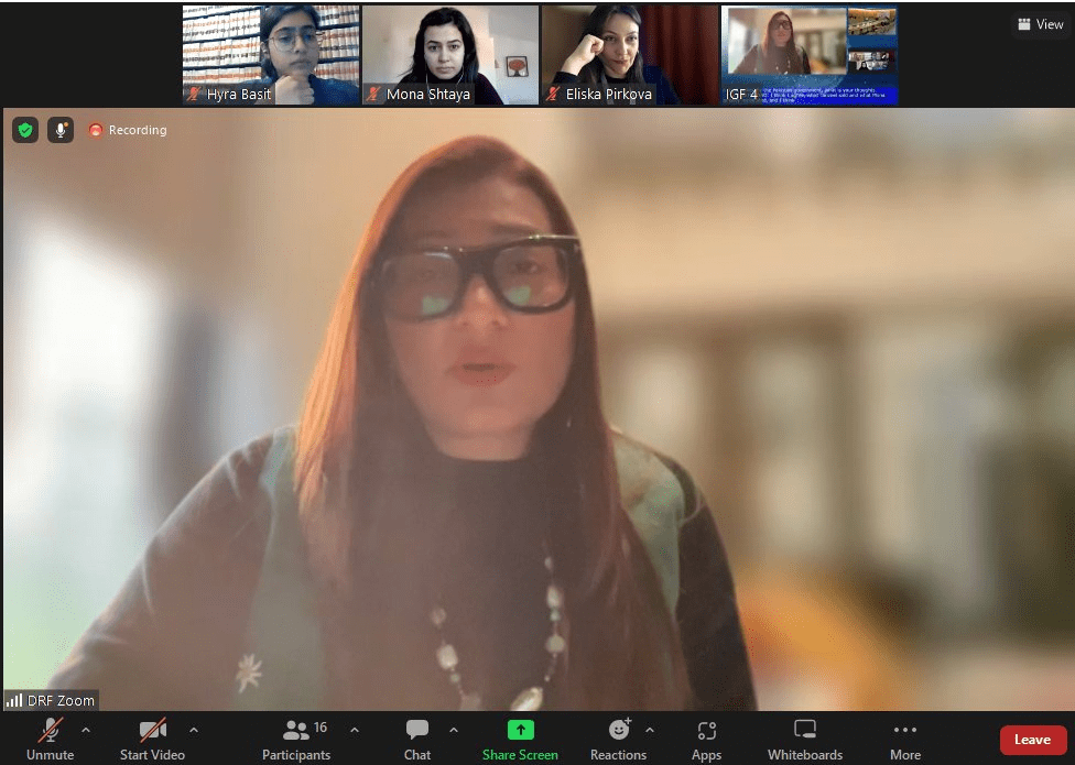 The former session aimed to start a discussion on the effect of cutting off internet access and online platforms by states and digital platform companies on the citizens of a country, particularly marginalized groups. The panel included Nighat Dad of DRF, Mona Shtaya of 7amleh, Tanzeel Khan of Kashmir Digital Rights, and Eliška Pírková of Access Now.