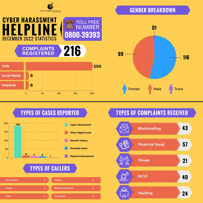 The Cyber Harassment Helpline received 216 complaints in December with 116 of these from women. If you’re encountering a problem online you can reach out to our helpline on 0800-39393, email us at helpdesk@digitalrightsfoundation.pk or reach out to us on our social media accounts. We’re available for assistance from 9 am till 5 pm, Monday to Sunday.