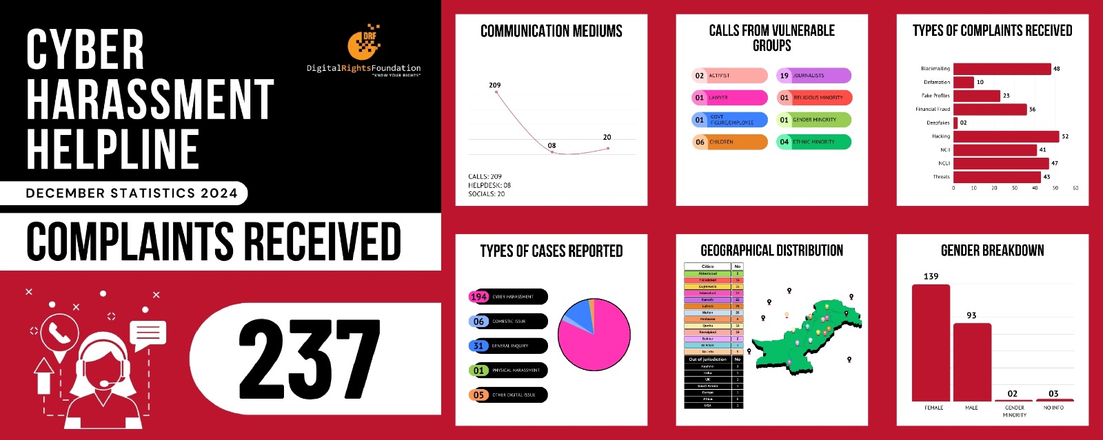 The Cyber Harassment Helpline received 237 complaints in December 2024, of which 82% were related to cyber harassment. The helpline also celebrated 8 years since its inception this month by sharing a case where the helpline team helped take down sensitive pictures of a complainant from social media platforms. Click here to listen to the story.