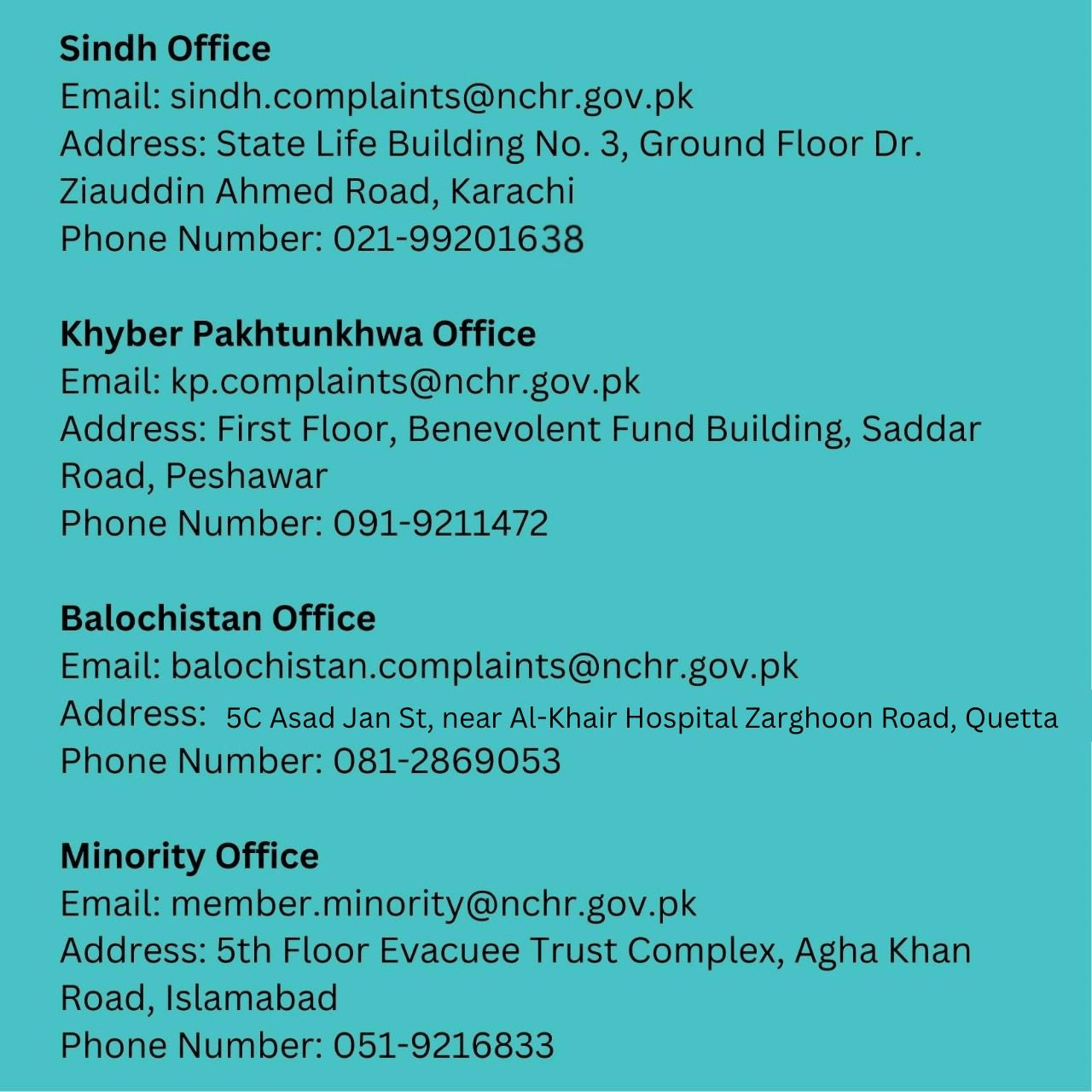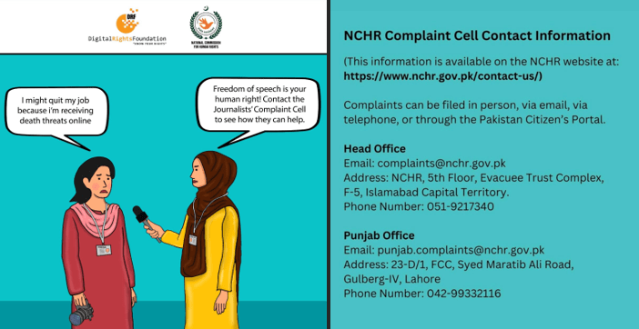 DRF and NCHR are operating a Complaint Cell to support journalists that have been the target of human rights abuses. The contact information for the Journalist Complaint Cell is available on the NCHR website at https://nchr.gov.pk/contact-us/