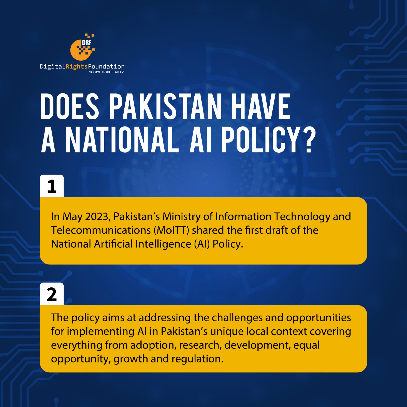DRF submitted it’s detailed feedback to the Ministry of Information Technology and Telecommunications (MOITT) on the ‘Draft National Artificial Intelligence Policy 2023’. Emerging technologies such as AI are rapidly informing our everyday lives and it is essential that regulation takes into account human rights and Pakistan’s specific context. Our submission seeks to provide a digital rights perspective and signpost loopholes within the existing policy.