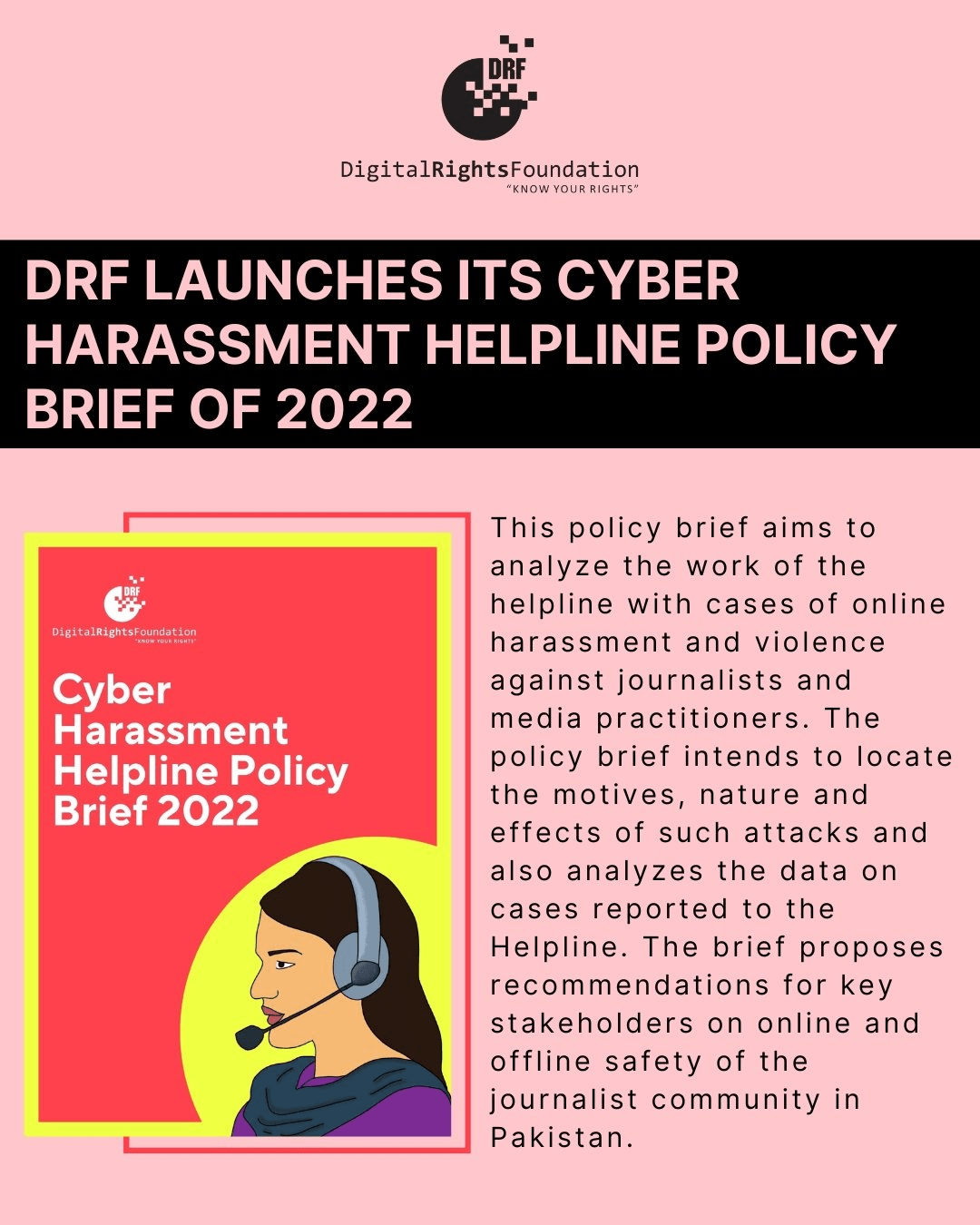 DRF launched its cyber harassment policy brief of 2022. The policy brief aims to analyze the work of the helpline with cases of online harassment and violence against journalists and media practitioners.