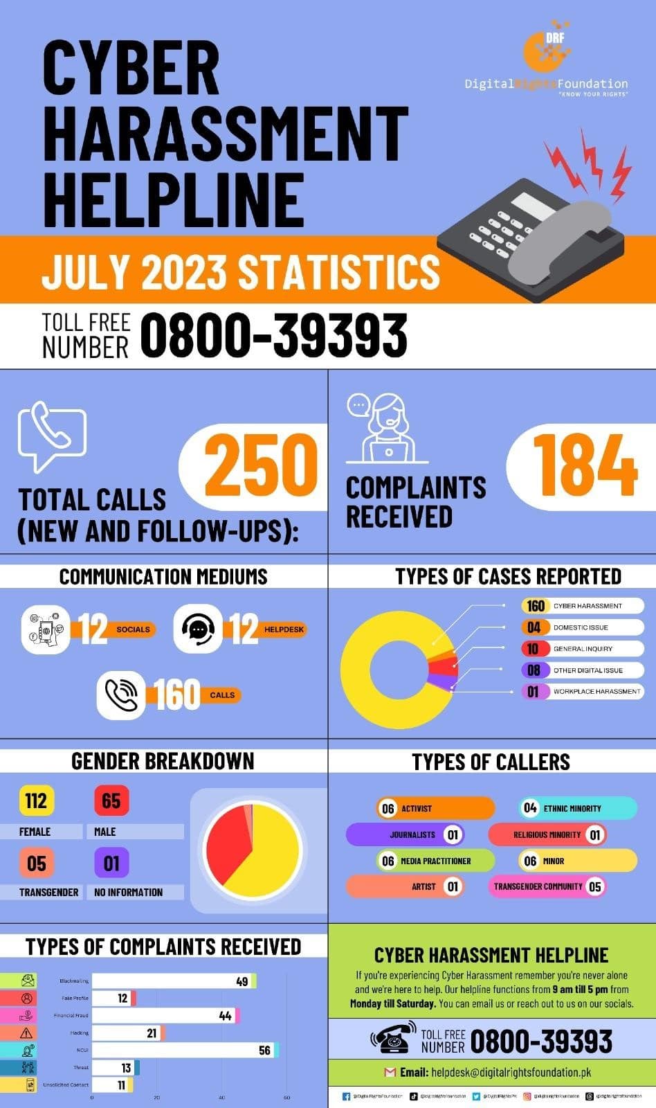 The Cyber Harassment Helpline received 250 complaints in total July, with 112 complaints by women and 5 from transgender persons. If you’re encountering a problem online, you can reach out to our helpline at 0800-39393, email us at helpdesk@digitalrightsfoundation.pk or reach out to us on our social media accounts. We’re available for assistance from 9 am to 5 pm, Monday to Sunday.