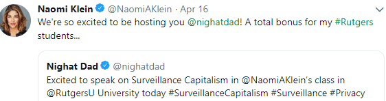 Nighat Dad spoke on surveillance capitalism in Naomi Klein’s class in Rutgers University