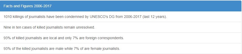 As per UNESCO data 1010 journalists have been killed between 2006 – 2017 in the line of duty.