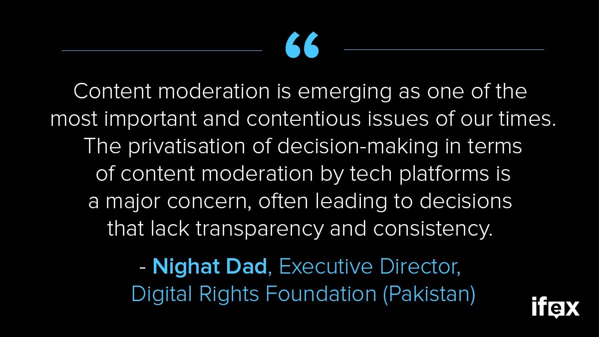 In a statement to IFEX, Nighat Dad reaffirmed that content moderation is becoming “one of the most important & contentious issues of our times,” noting that the privatisation of decision-making often overlooks the demands and needs of users outside the west.