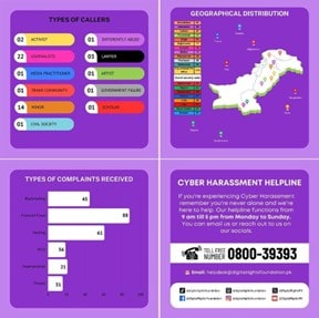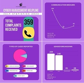 The Cyber Harassment Helpline received 359 complaints in total in July 2024, with 209 complaints by women. If you’re encountering a problem online, you can reach out to our helpline at 0800-39393, email us at helpdesk@digitalrightsfoundation.pk or reach out to us on our social media accounts. We’re available for assistance from 9 am to 5 pm, Monday to Sunday.