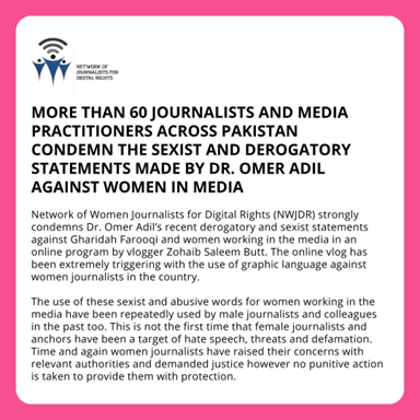 More than 60 Journalists and Media Practitioners Across Pakistan Condemn the Sexist and Derogatory Statements Made by Dr. Omer Adil Against Women in Media