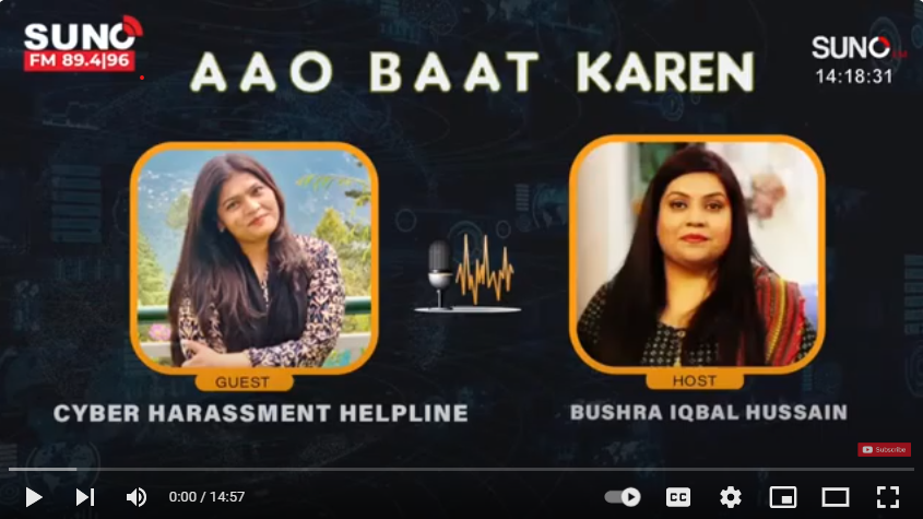Anmol Sajjad delivered a virtual session on online harassment on 25 June 2024, with Suno FM Radio 89.4-96 with Bushra Iqbal. The session focused on online harassment in the digital era. This also includes the discussion of consequences for minors and vulnerable communities and suggested solutions for mitigating these risks. The prevention of online harassment and digital detox were also discussed during the session.