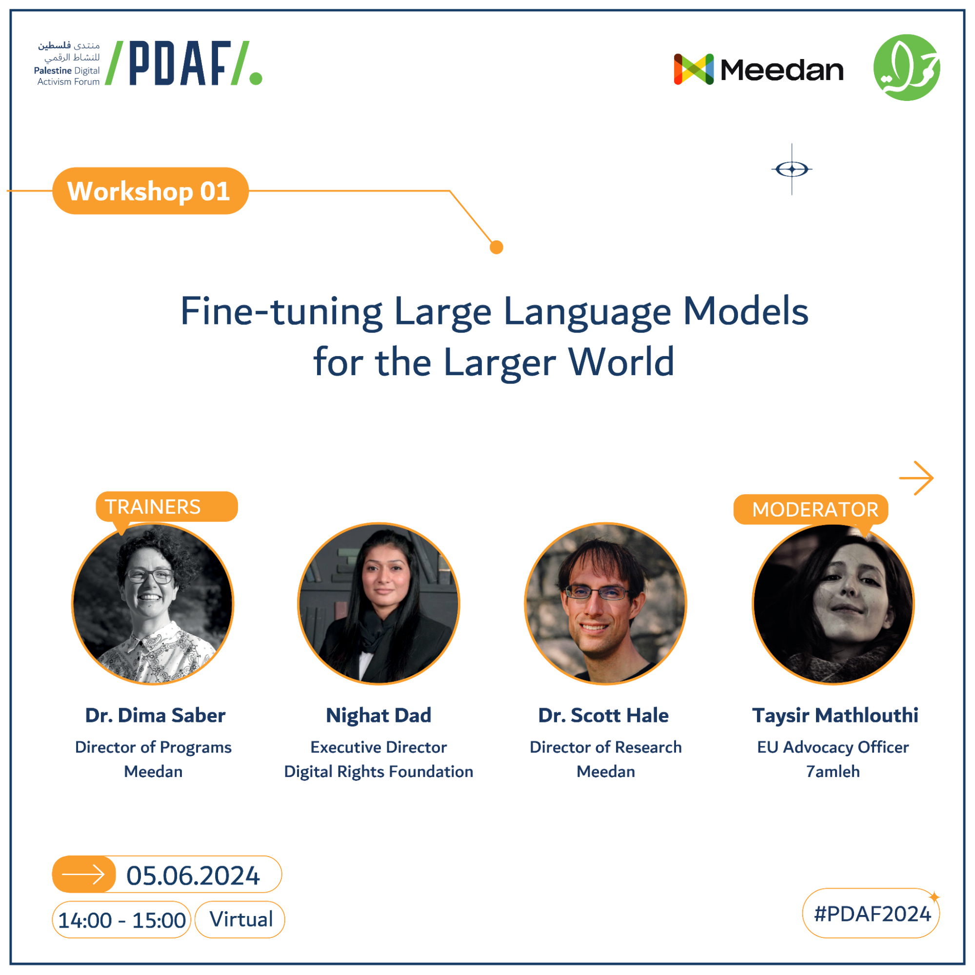 At PDAF, Meedan’s workshop featured Dr. Dima Saber and Dr. Scott A. Hale alongside Nighat Dad, founder and executive director of the Digital Rights Foundation (DRF) in Pakistan. Taysir Mathlouthi of 7amleh — The Arab Center for the Advancement of Social Media moderated the panel. The session focused on fine-tuning large language models (LLMs) for the Larger World, Meedan’s preferred term for the Global South.
