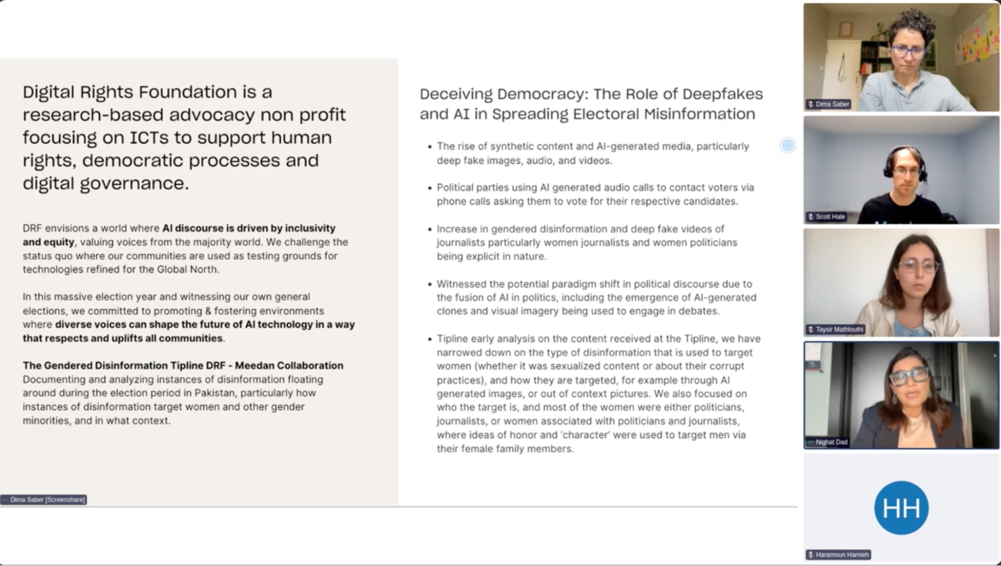 Nighat Dad, DRF’s Executive Director, as she joins the virtual discussion on how generative AI supercharges information manipulation.