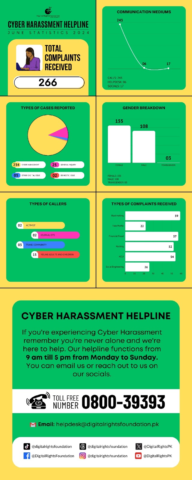 The Cyber Harassment Helpline received 266 complaints in total in June 2024, with 155 complaints by women. If you’re encountering a problem online, you can reach out to our helpline at 0800-39393, email us at helpdesk@digitalrightsfoundation.pk or reach out to us on our social media accounts. We’re available for assistance from 9 am to 5 pm, Monday to Sunday.