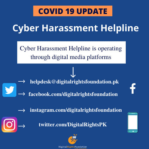 In wake of the Pandemic COVID 19, Digital Rights Foundation decided to take all the precautionary measures necessary to prevent the spread of this infection, prioritizing both the health of its team members and its callers by shifting the operations of Cyber Harassment Helpline virtual and responding to complaints through emails and social media platforms. Contact us through our email helpdesk@digitalrightsfoundation.pk