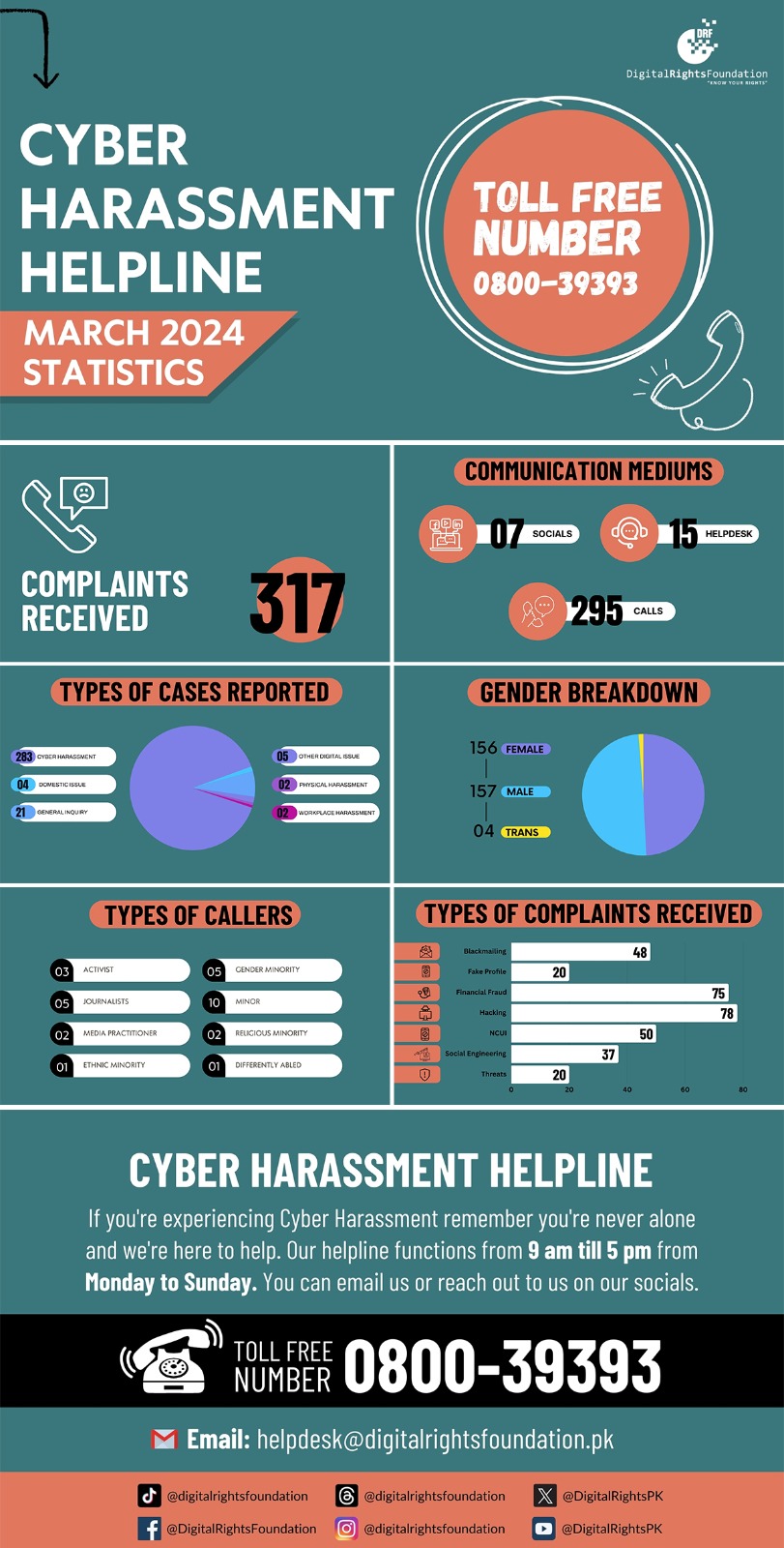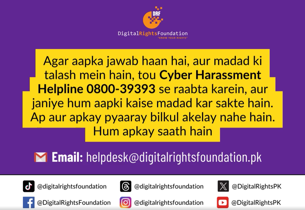 If you’re encountering a problem online, you can reach out to our helpline at 0800-39393, email us at helpdesk@digitalrightsfoundation.pk or reach out to us on our social media accounts. We’re available for assistance from 9 am to 5 pm, Monday to Sunday.