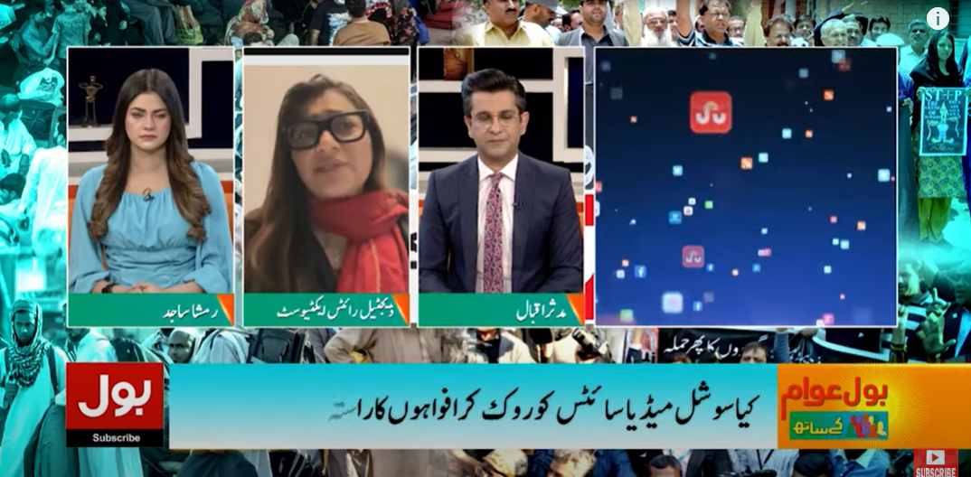 DRF’s Executive Director, Nighat Dad spoke with Bol TV about the resolution in the Senate to ban social media in Pakistan. She expressed her frustration with this way of thinking and how these actions damage Pakistan’s image on the international stage. She went on to say that a blanket ban on social media or even internet shutdowns will not stop online disinformation; instead, we must identify the root of the problem and address it structurally, as well as reform our society’s thinking that allows people to cause harm through online platforms.