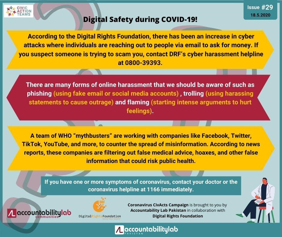 We worked with Accountability Labs on one of their issues of their ‘Pakistan Coronavirus CivAct Campaign’ Newsletter. This particular issue was about digital safety and security during this pandemic. This newsletter went through the types of attacks that people were facing through the lockdown and what they can do both in a preventative manner and in a defensive manner.