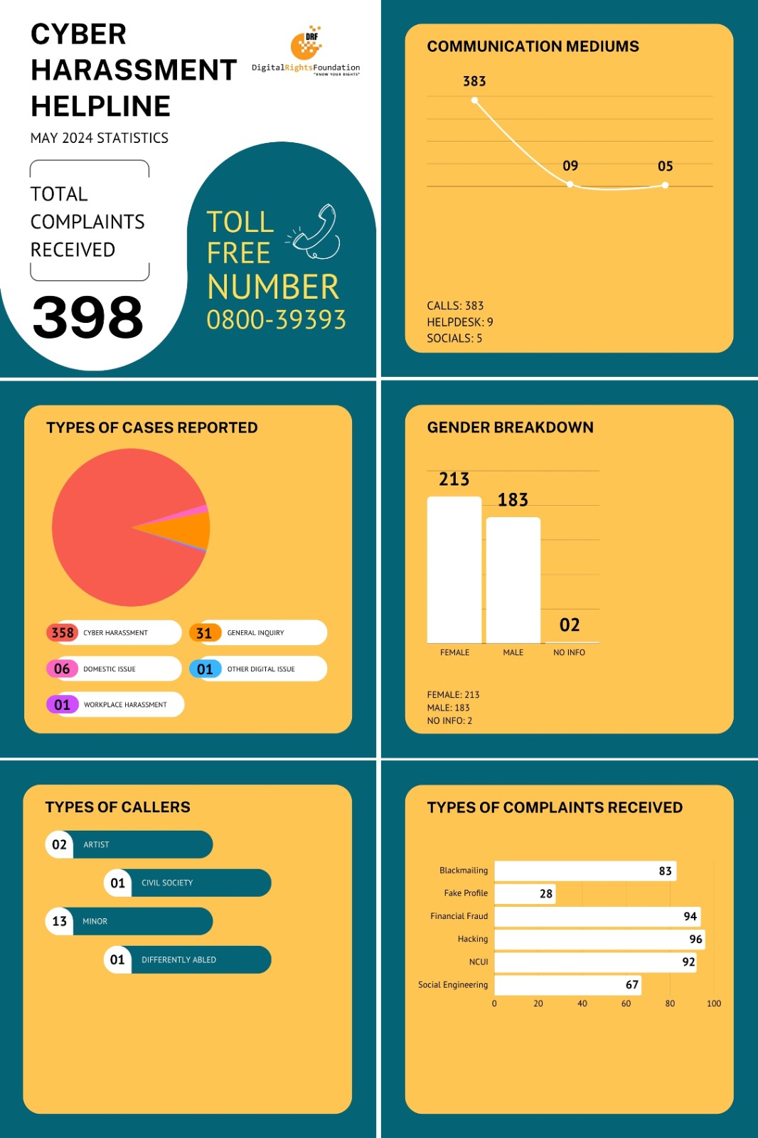 The Cyber Harassment Helpline received 398 complaints in total in May 2024, with 213 complaints by women. If you’re encountering a problem online, you can reach out to our helpline at 0800-39393, email us at helpdesk@digitalrightsfoundation.pk or reach out to us on our social media accounts. We’re available for assistance from 9 am to 5 pm, Monday to Sunday.