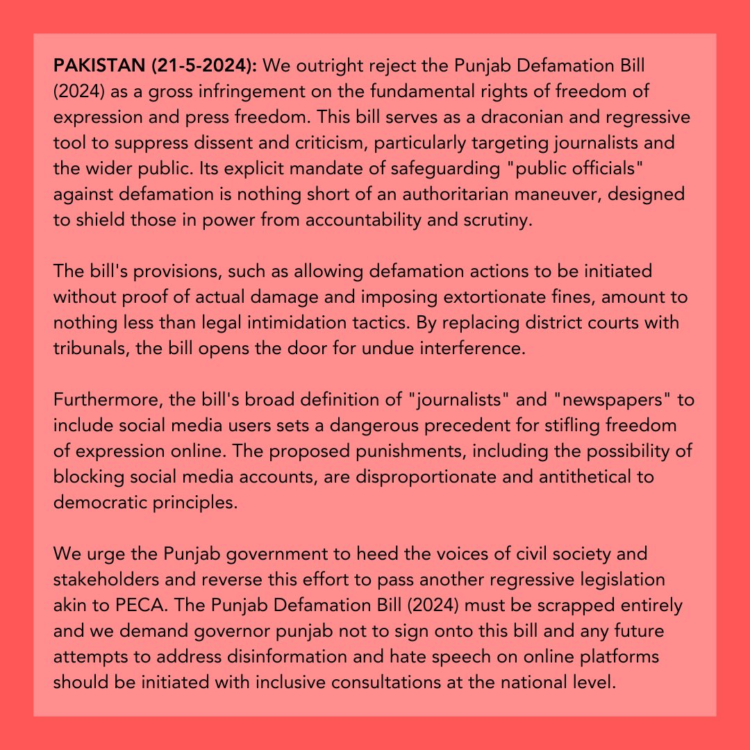 DRF joined over 80 civil society organizations and journalists in rejecting the Punjab Defamation Bill. The Punjab Defamation Bill (2024) is a significant infringement on freedom of expression and press freedom, serving as a draconian tool to suppress dissent, particularly targeting journalists and the public. The bill’s provisions, which allow defamation actions without proof of actual damage and impose harsh fines, amount to legal intimidation tactics. By replacing district courts with tribunals, the bill enables undue interference and sets a dangerous precedent by broadly defining “journalists” and “newspapers” to include social media users. This legislation’s disproportionate punishments, such as blocking social media accounts, are antithetical to democratic principles. In the statement, we urge the Punjab government to reverse this regressive effort and engage in inclusive consultations to effectively address disinformation and hate speech.