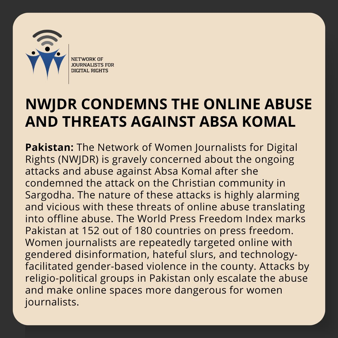 The Network of Women Journalists for Digital Rights (NWJDR) condemns the online abuse and threats against Absa Komal
