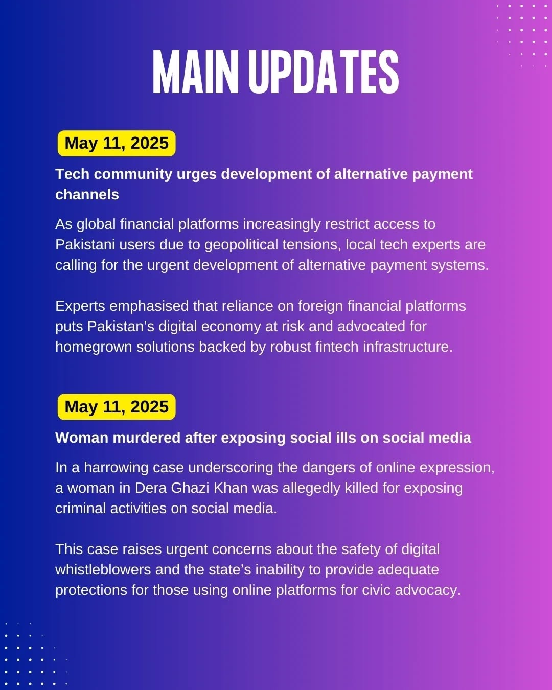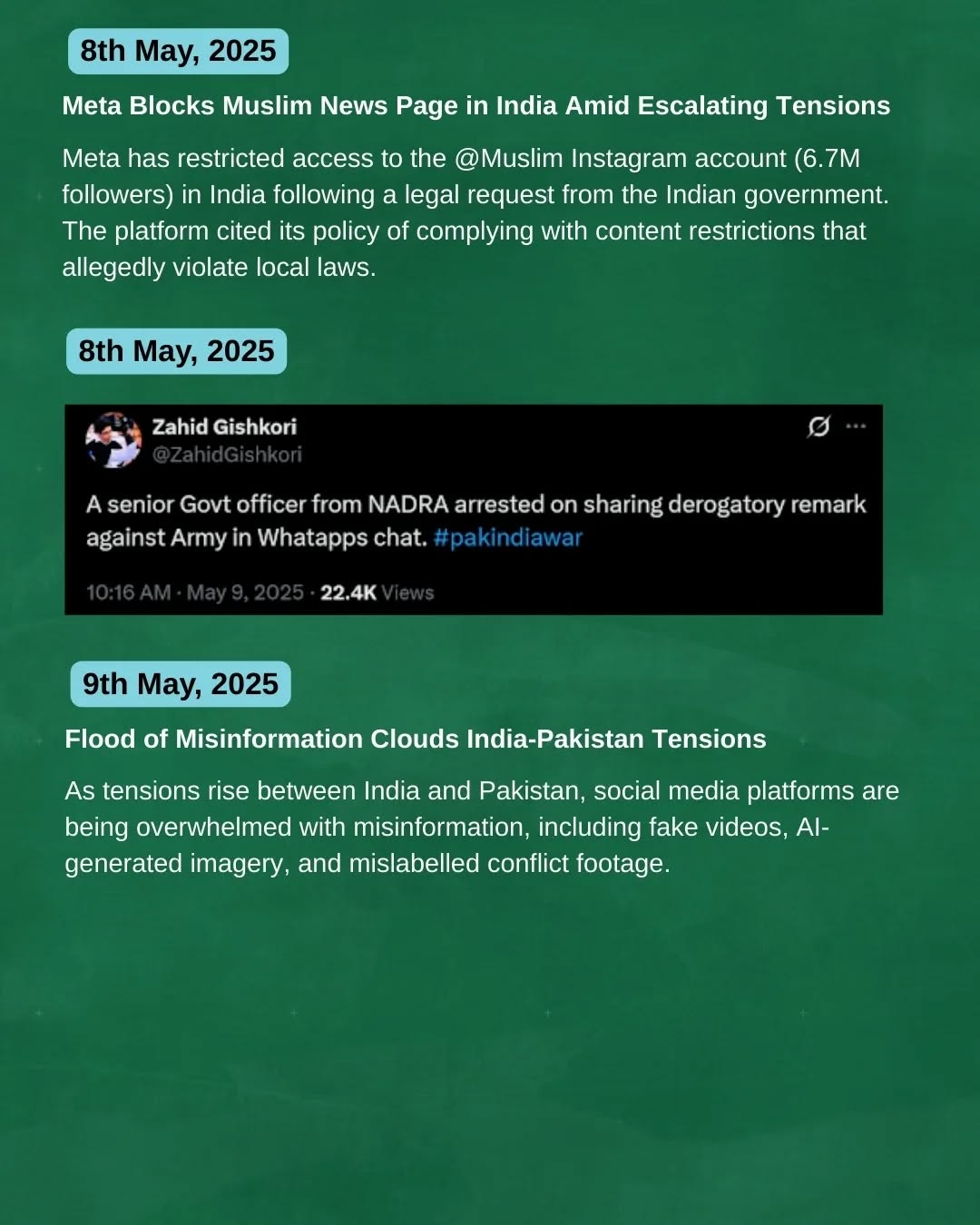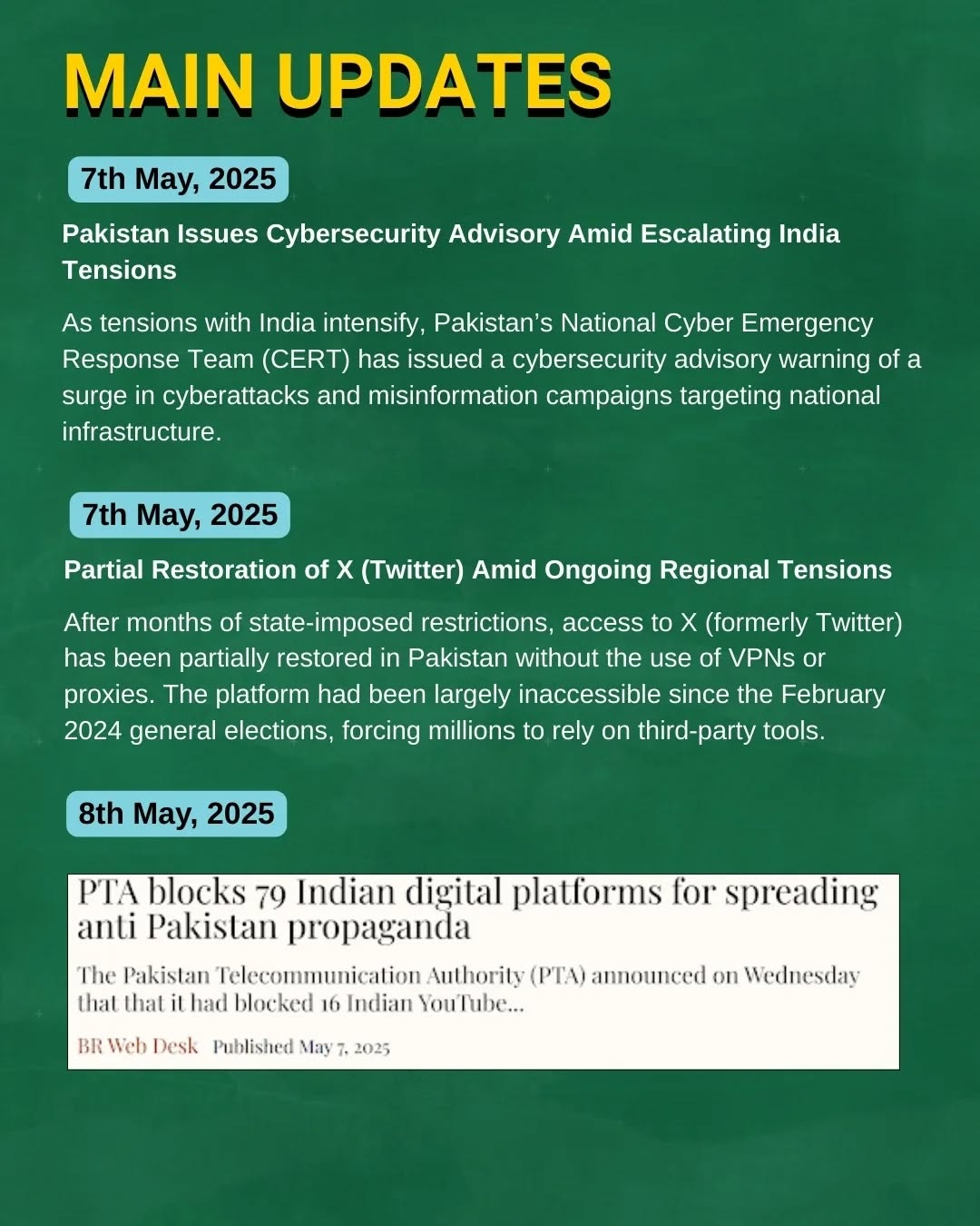 DRF continued to provide weekly updates from its Digital Rights Tracker, However, given the rapid pace of escalations between India and Pakistan in May, a limited edition Indo-Pak Escalations Tracker was launched to provide frequent updates on cybersecurity breaches, arbitrary online restrictions, and misinformation/disinformation.