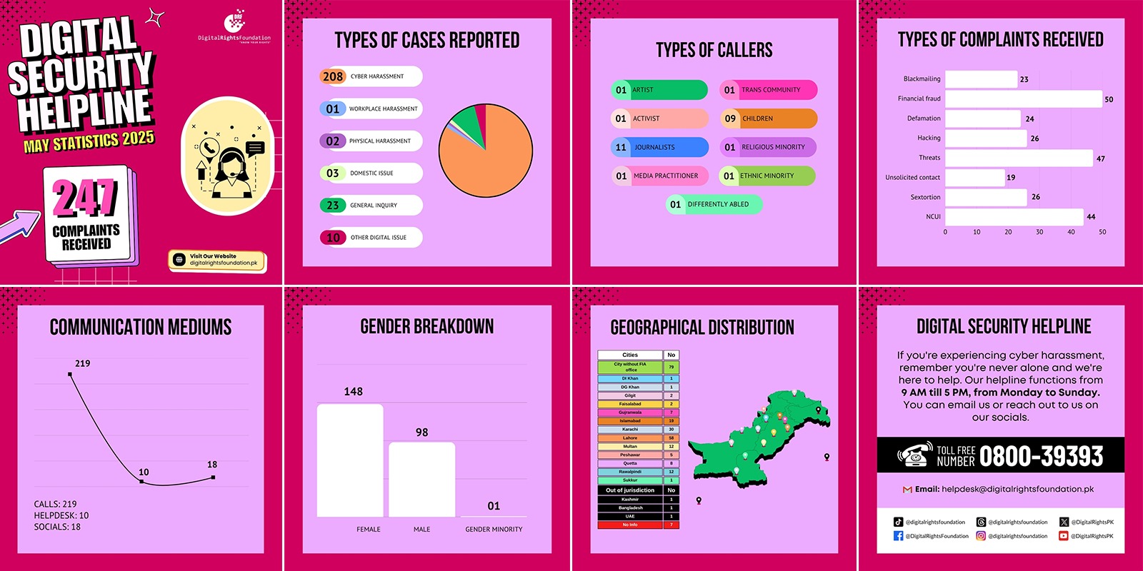 The Digital Security Helpline received 247 complaints in May 2025, of which 208 were related to cyber harassment.