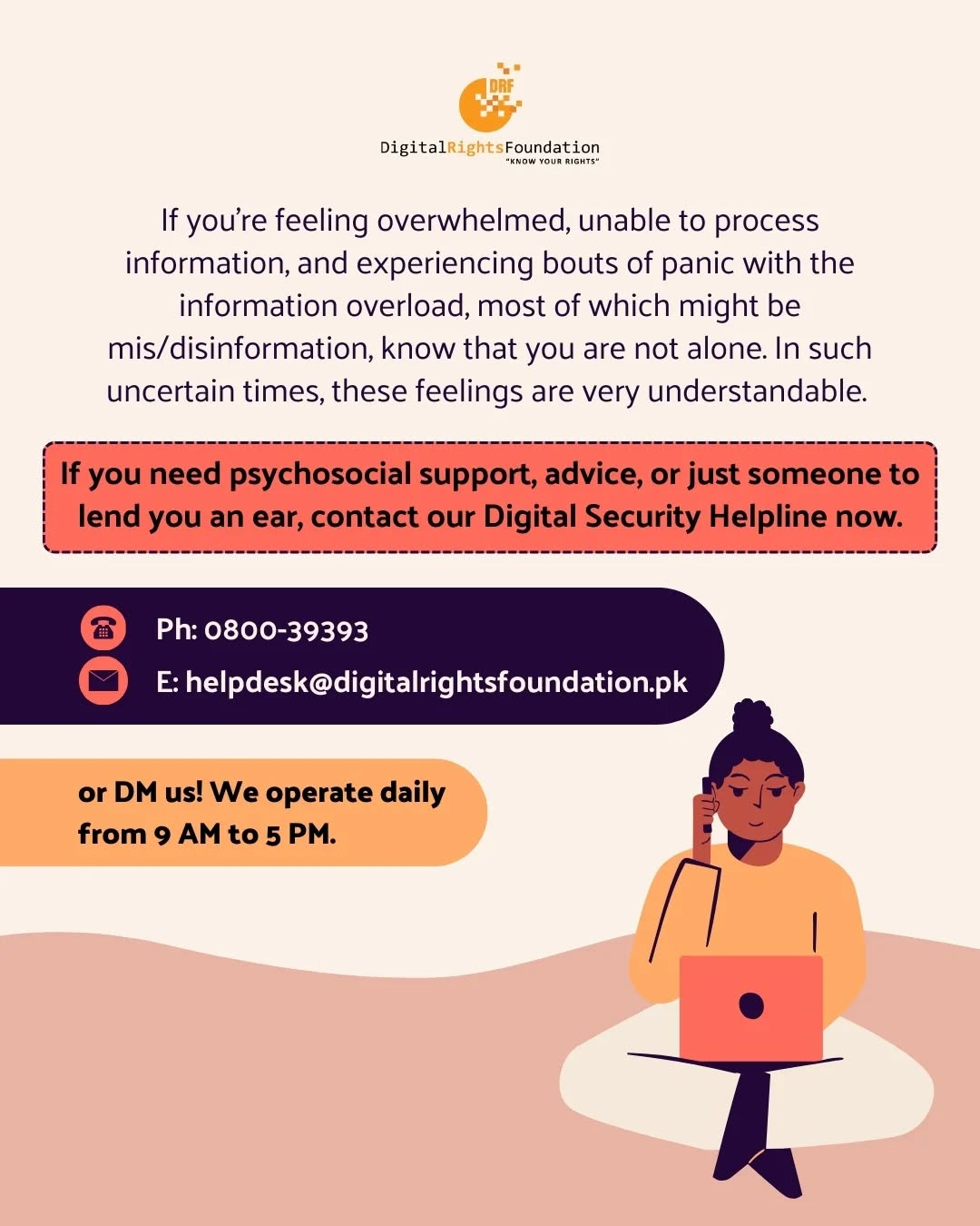If you’re encountering a problem online, you can reach out to our helpline at 0800-39393, email us at helpdesk@digitalrightsfoundation.pk or reach out to us on our social media accounts. We’re available for assistance from 9 AM to 5 PM, Monday to Sunday.