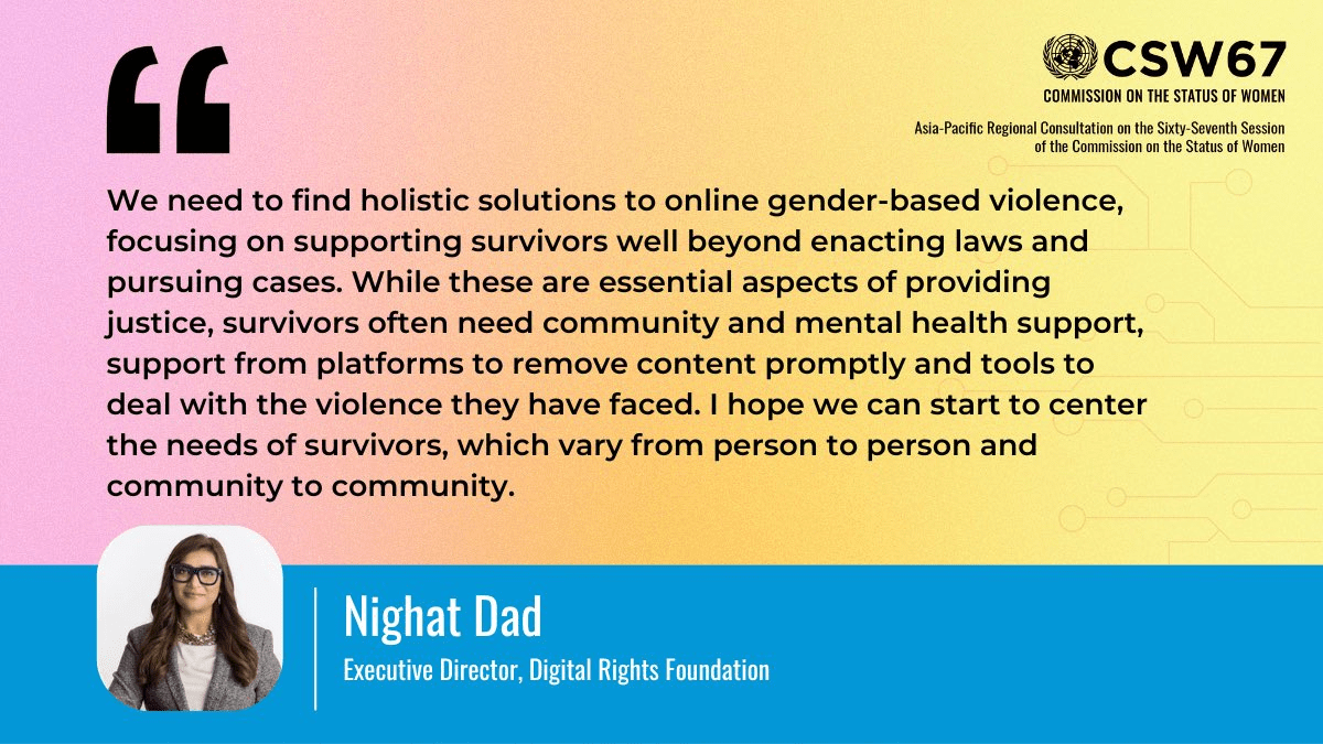 DRF’s Executive Director Nighat Dad took part in a panel hosted by UN Women in preparation of the CSW 67 in March 2023 on tech-facilitated GBV. Nighat spoke from her extensive experience on the issue on adopting a holistic approach to tackling TFGBV, particularly investing in survivor-centric approaches.