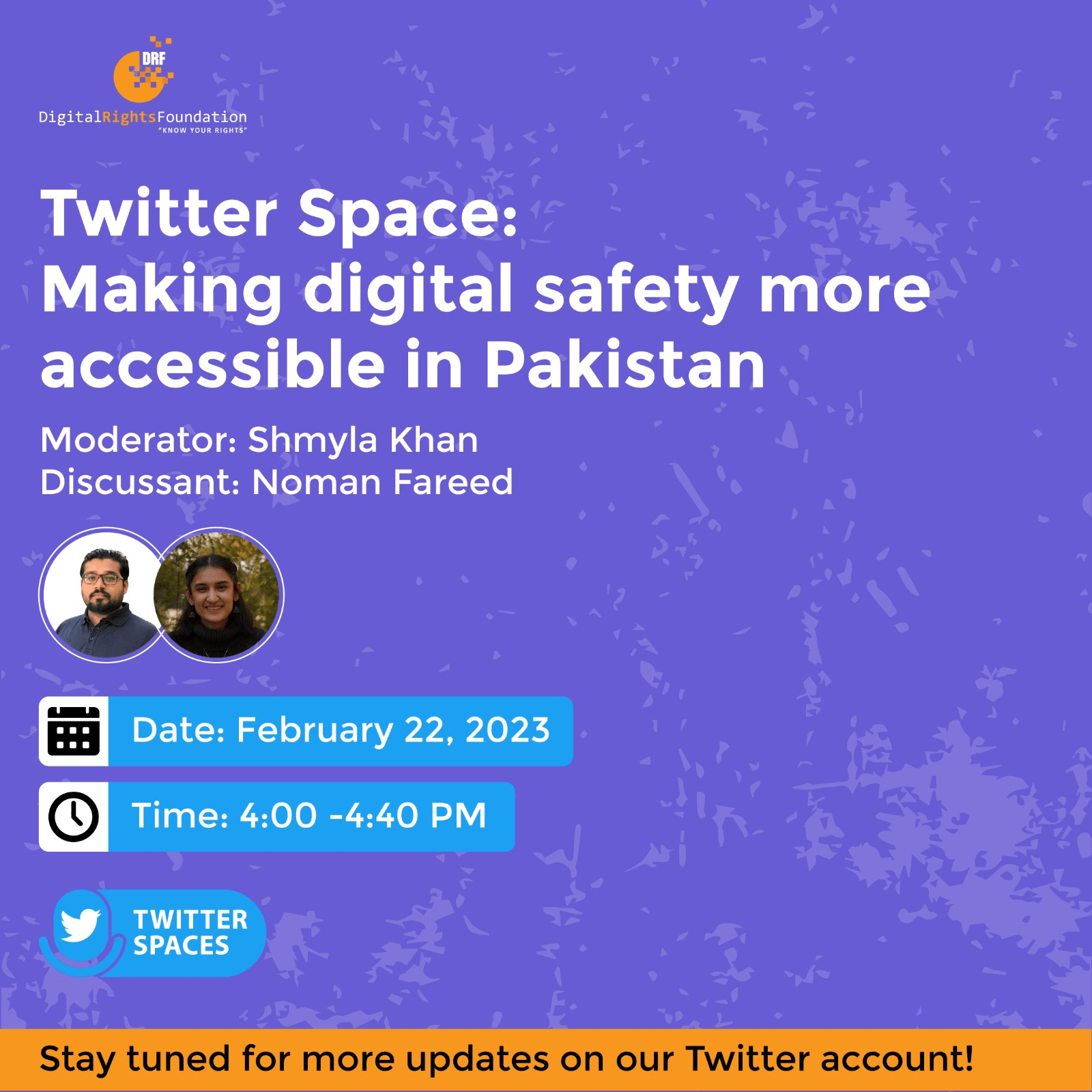 DRF hosted a Twitter space on how to make digital safety and security more accessible to general population in the country, particularly those communities which lack digital literacy. The space was hosted by Shmyla Khan with Noman Fareed, Digital Security Expert as speaker. A recording of the space can be heard here.