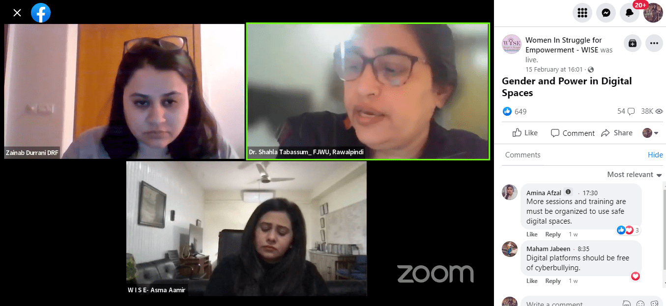 Project Manager Zainab Durrani appeared in a Virtual Cafe webinar organized by WISE (Women in Struggle for Empowerment) on the 15th of February, 2023. The online session was cast live via the WISE Facebook page and focused on ‘Gender and Power in Digital Spaces’