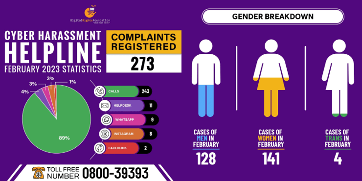The Cyber Harassment Helpline received 273 complaints in February with most cases being around financial fraud. If you’re encountering a problem online, you can reach out to our helpline on 0800-39393, email us at helpdesk@digitalrightsfoundation.pk or reach out to us on our social media accounts. We’re available for assistance from 9 am till 5 pm, Monday to Sunday.