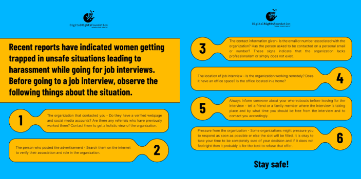 Recent reports have indicated women getting trapped in unsafe situations leading to harassment while going for job interviews. Before you go for an interview observe the following things about the situation.For further assistance and help contact our cyber harassment helpline on 0800-39393, helpdesk@digitalrightsfoundation.pk or our socials.
