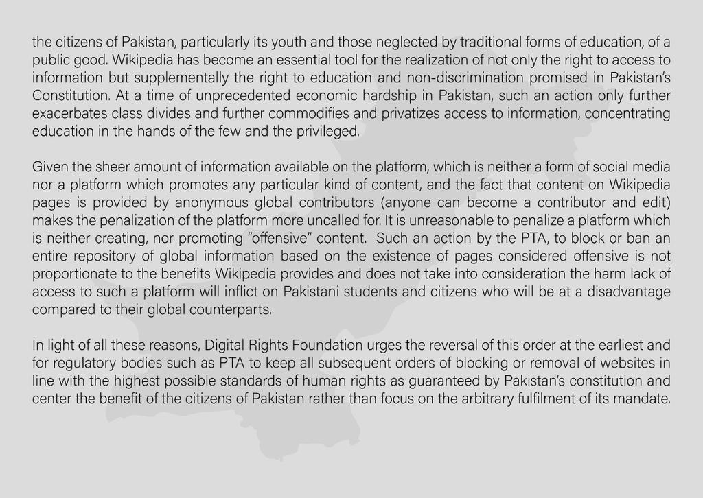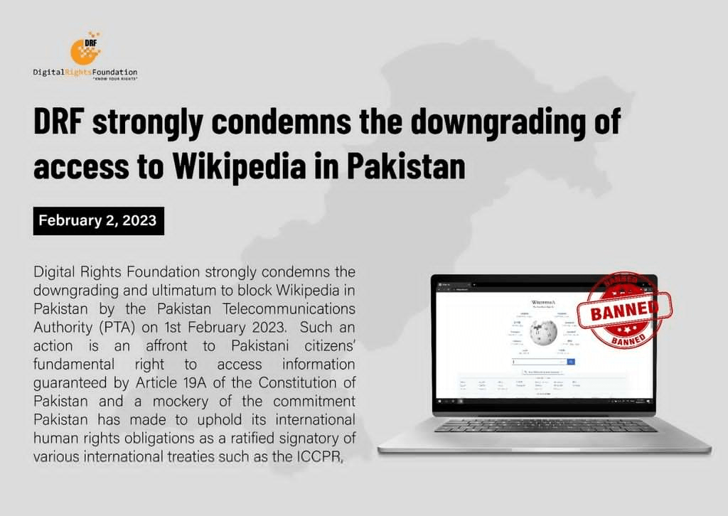 DRF strongly condemns the downgrading of access to Wikipedia in Pakistan. The PTA has ‘degraded’ access to Wikipedia for 48 hours with the possibility of completely banning the platform if it does not comply with their requests. #SaveWikipedia