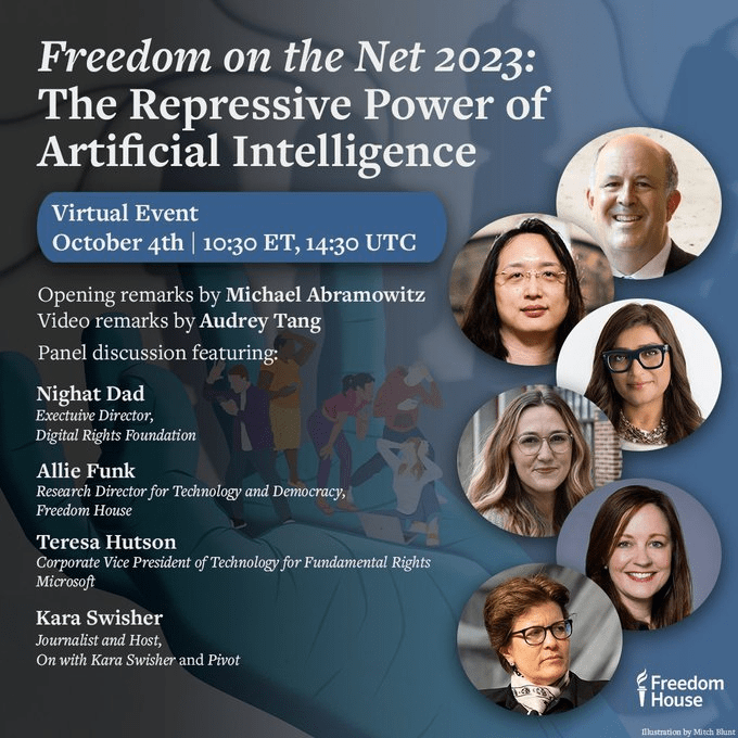 The Digital Rights Foundation’s Executive Director, Nighat Dad, spoke at the Freedom House event to launch “Freedom on the Net 2023: The Repressive Power of Artificial Intelligence.” The event aimed to shed light on key findings from the 2023 report against the backdrop of increasing scale, speed, and efficiency of digital repression driven by advances in artificial intelligence. The event, which featured eminent speakers such as Michael J. Abramowitz, Allie Funk, Audrey Tang, Teresa Hutson, and Kara Swisher, provided a thorough examination of global trends, country-specific developments, and best practices to protect internet freedom in the face of evolving challenges.