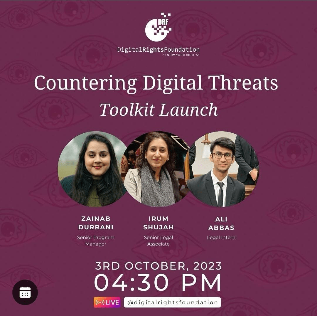 DRF conducted an Instagram Live to launch our “Countering Digital Threats” Toolkit. In the Instagram Live, along with our Legal intern, Ali Abbas Gillani, we talked about the growing need for an easy-to-read toolkit in the current landscape of social media usage, providing accessibility to online users on how to safeguard themselves against digital threats and approach online safety redressal mechanisms as well as know more about the legal recourse available to the public.