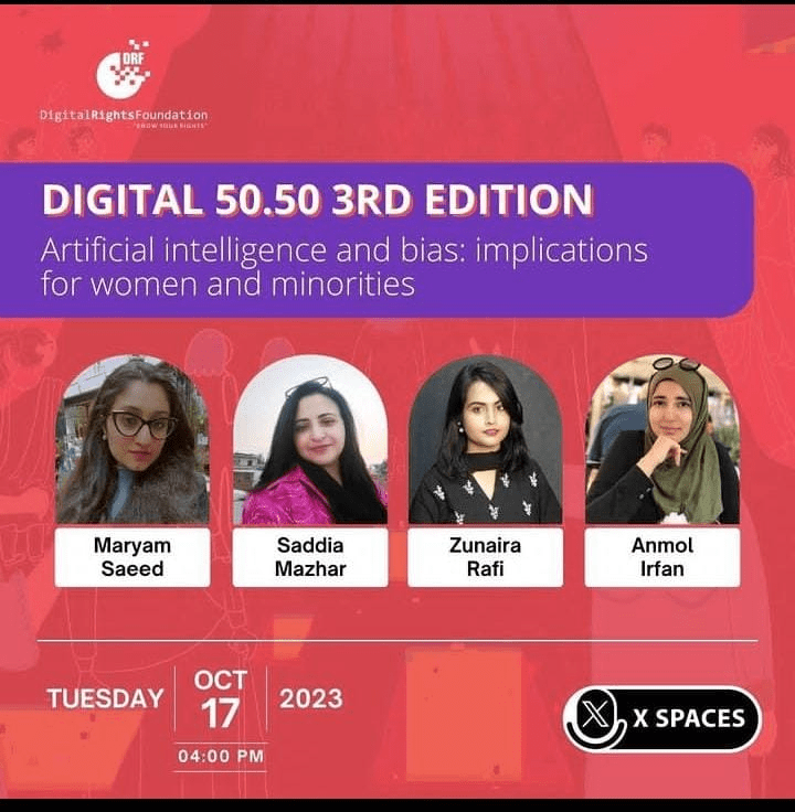 DRF organized a Twitter Space where we delved into the themes of the 3rd edition of Digital 50.50, focusing on ‘Artificial Intelligence and Bias: Implications for Women and Minorities.’ We were honored to host three distinguished contributors, namely Anmol Irfan, Zunaira Rafi, and Sadia Mazhar from Digital 50’50, with the aim of expanding the reach of their insightful articles. This engaging session took place on October 17, 2023.