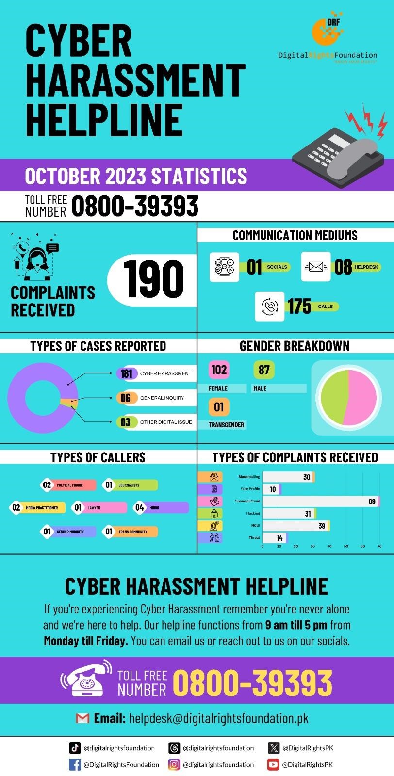 The Cyber Harassment Helpline received 190 complaints in total October, with 87 complaints by men. If you’re encountering a problem online, you can reach out to our helpline at 0800-39393, email us at helpdesk@digitalrightsfoundation.pk or reach out to us on our social media accounts. We’re available for assistance from 9 am to 5 pm, Monday to Friday.
