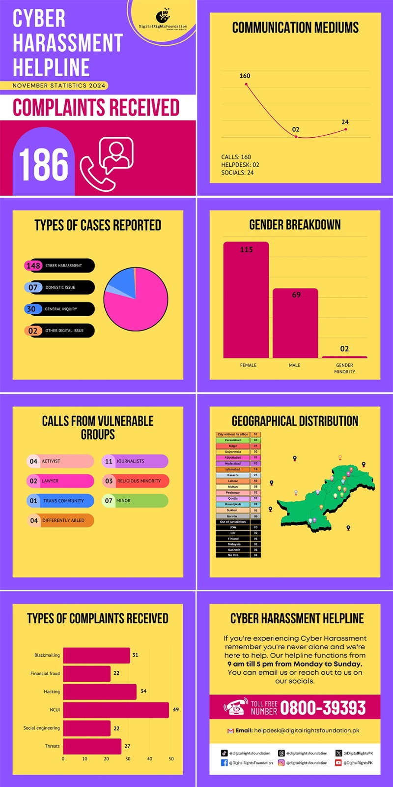 The Cyber Harassment Helpline received 186 complaints in total in November 2024, around 80% of which were related to cyber harassment.