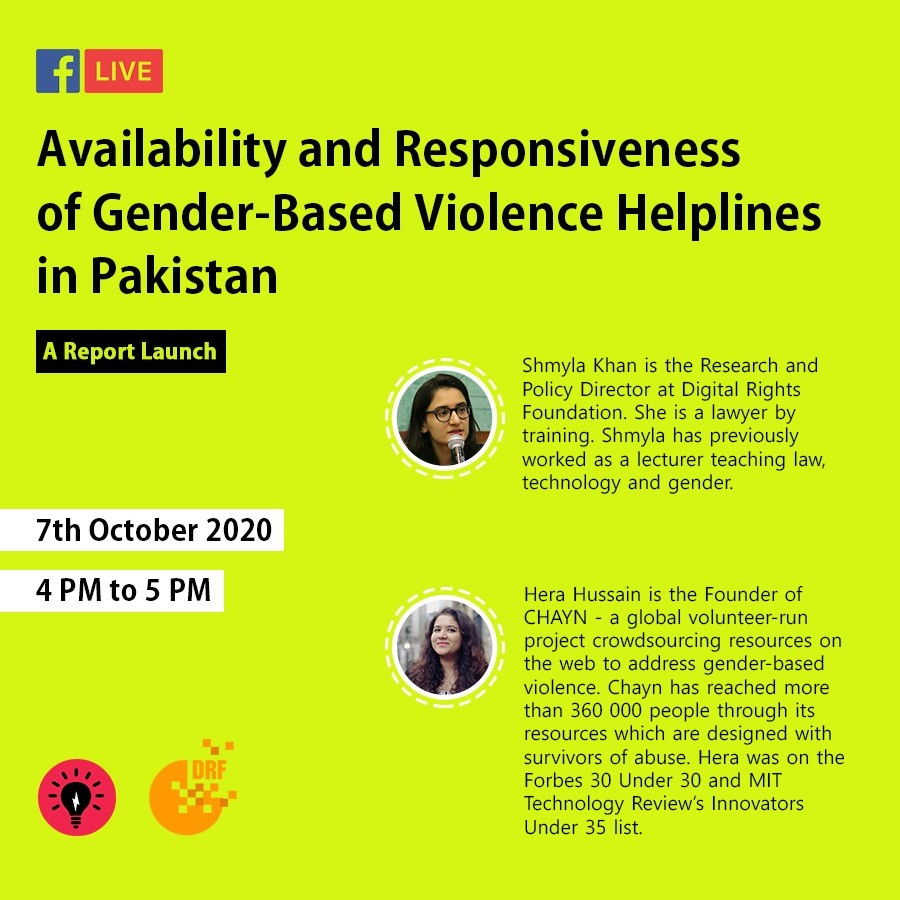 Shmyla from DRF was in conversation with Hera Hussain from Chyan to talk about the launch of our report on helplines working on gender-based violence in Pakistan. The report was done in collaboration with Chayn (you can follow them on Twitter: @ChaynHQ and check out their own on their website: https://chayn.co/).