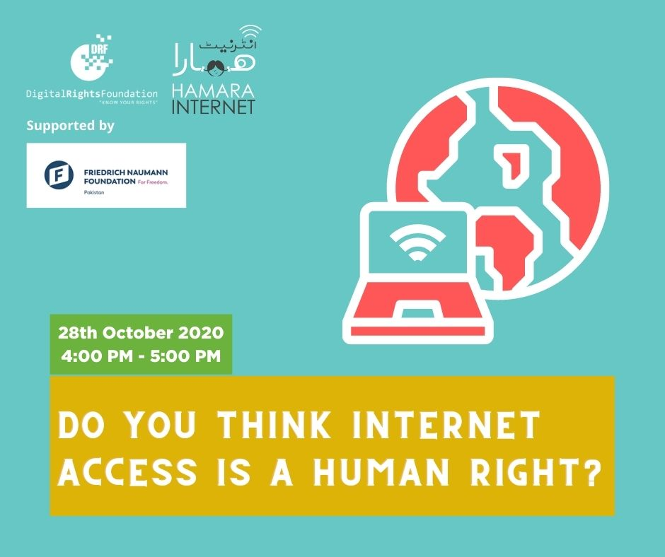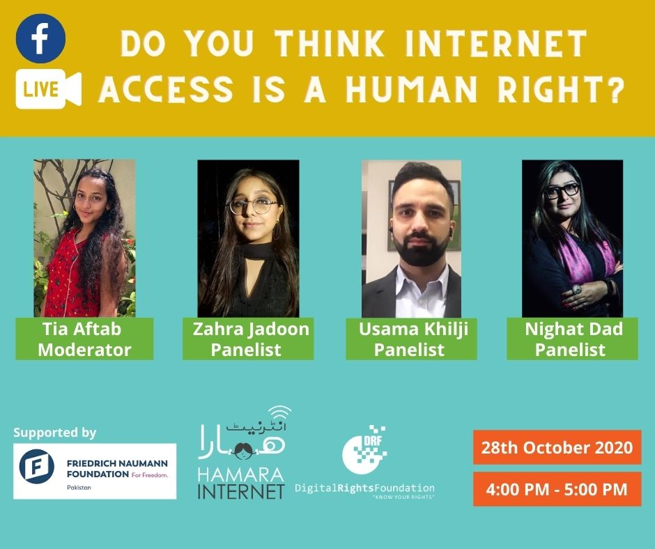 DRF conducted a panel discussion on Facebook live on ‘Do you think internet access is a human right’ with the support of Friedrich Naumann Foundation on the 28th of October. The panel included DRF’s youth ambassadors Tia Aftab, Zahra Jadoon, Usama Khilji of Bolo Bhi and Nighat Dad executive director of DRF. The discussion focused on what is the internet and why internet access is important.
