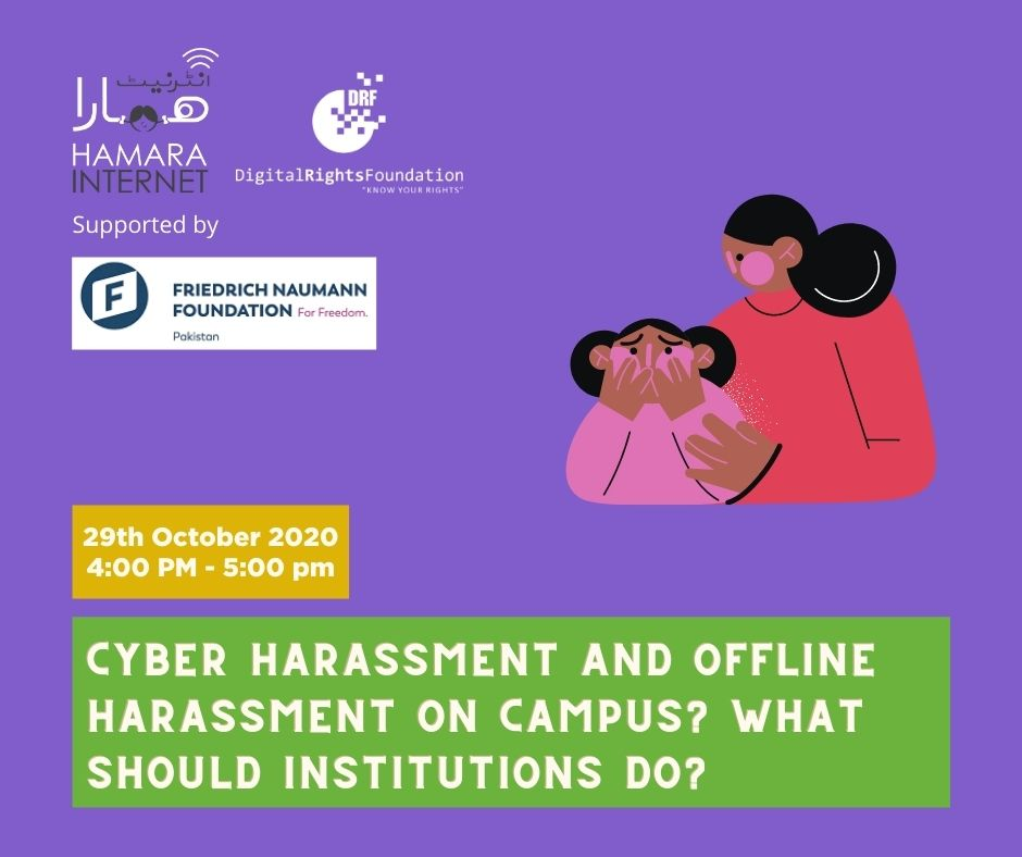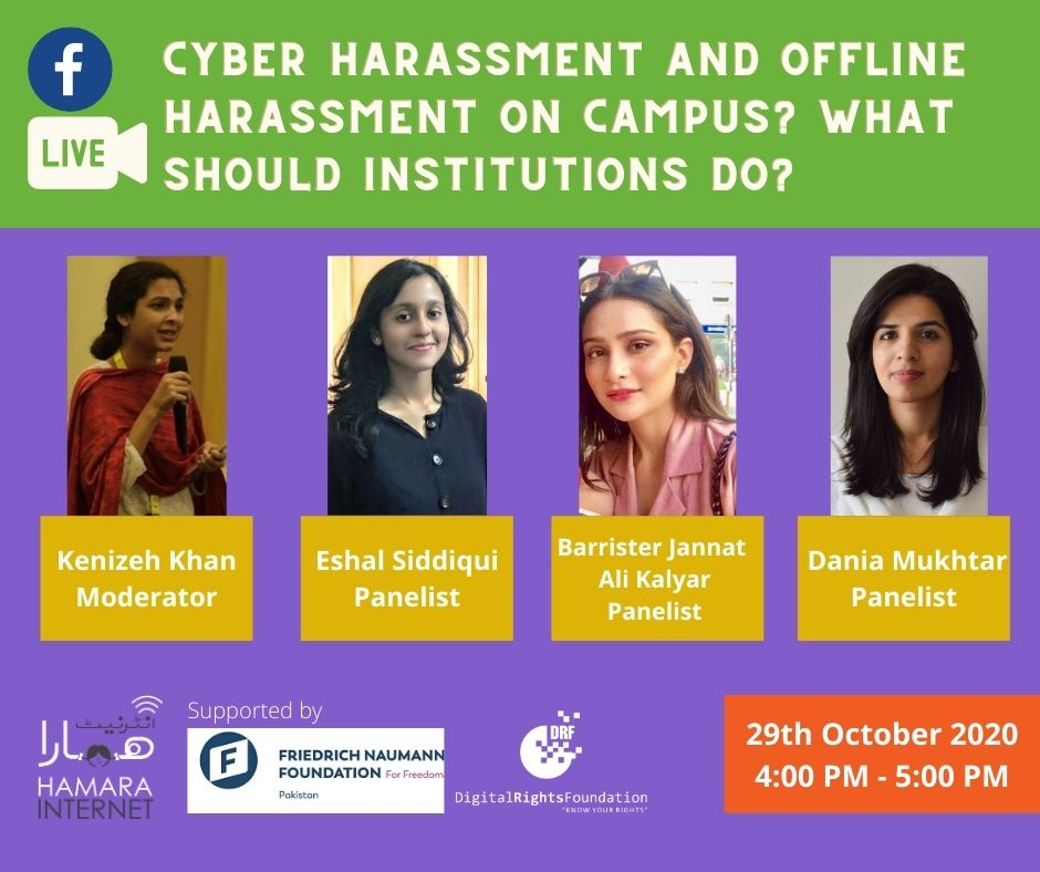 DRF conducted a panel discussion on ‘cyber harassment and offline harassment on campus? What should institutions do?’ with Friedrich Naumann Foundation on the 29th October. The panel discussion included DRF’s youth ambassadors Kenizeh Khan, Eshal Siddiqui, Barrister Jannat Ali Kalyar and Dania Mukhtar of DRF. The discussion highlighted the responsibility of institutions to protects its student body and the need to believe victims when they share their experiences of online and offline harassment.