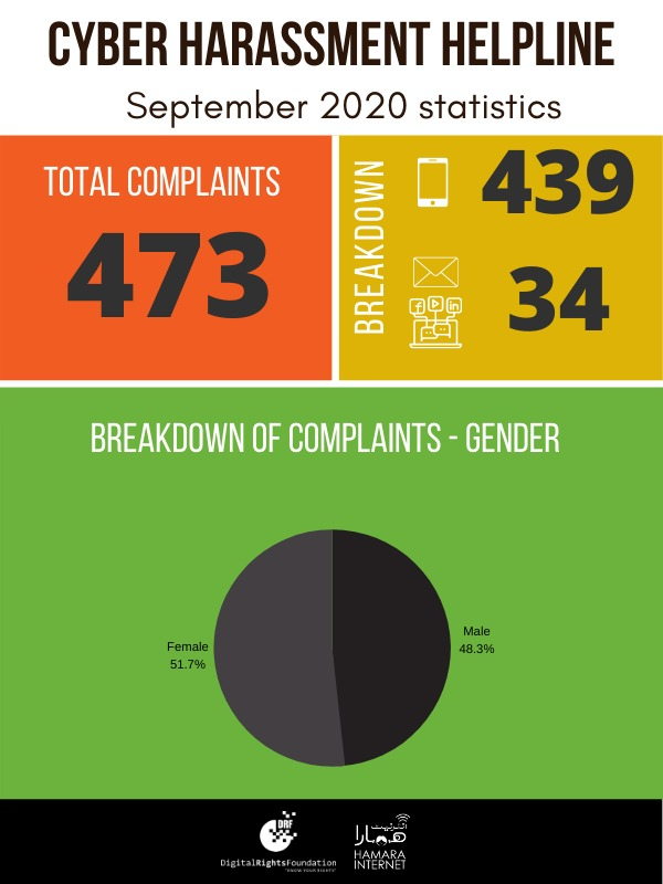Cyber Harassment Helpline received 473 complaints in the month of September. In comparison to the previous month of August, this number has slightly increased. It shows that there was a spike in the cases of online violence especially blackmailing through non consensual use of information and images.The number of male complainants calling on behalf of their female friends or family members has also increased. Another observed trend is of social engineering through which people are coerced into sharing their personal details like National Identity Card number, WhatsApp code, bank account details and, e-wallet details making them susceptible to hacking and financial fraud.